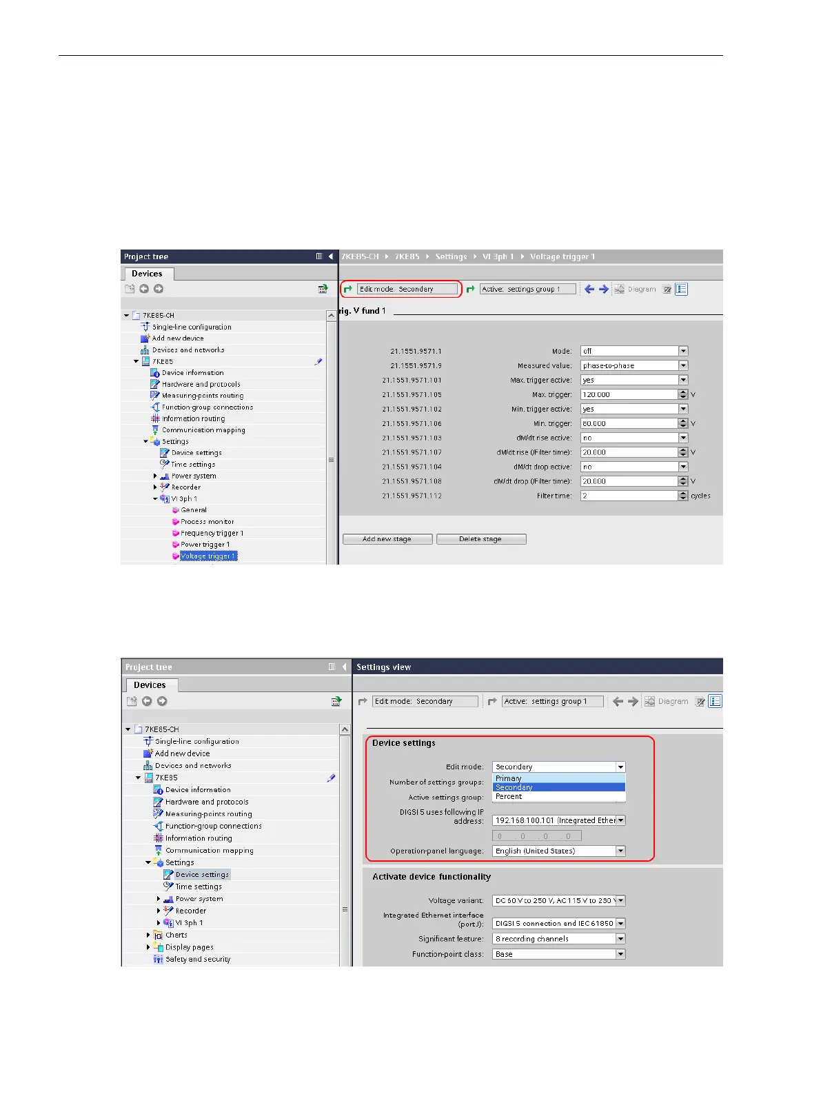 The following setting example shows how you can change the transformer ratio in DIGSI 5, and what impact