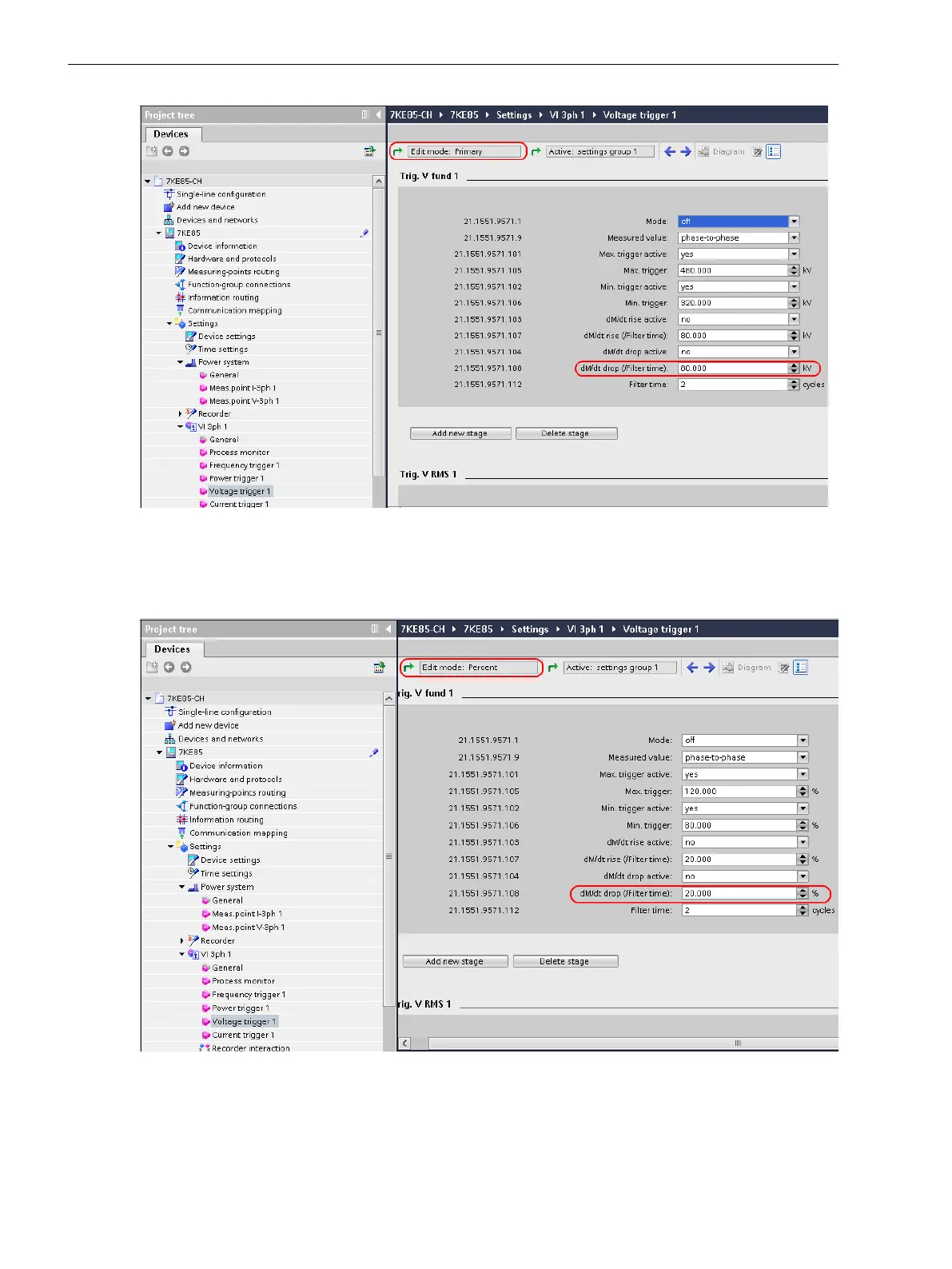 Example for the Threshold Value of the Voltage Trigger Tripping Stage (Edit Mode: Percent)