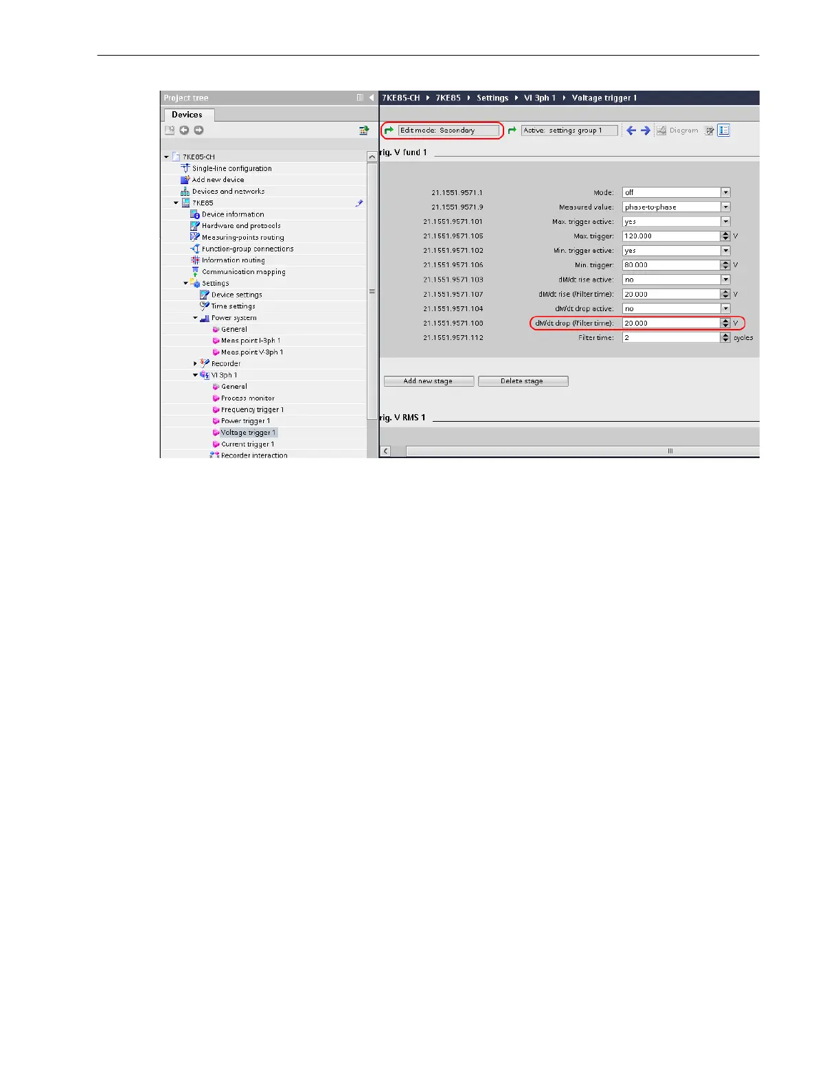 Example for the Threshold Value of the Voltage Trigger Tripping Stage (Edit Mode: Secondary)
