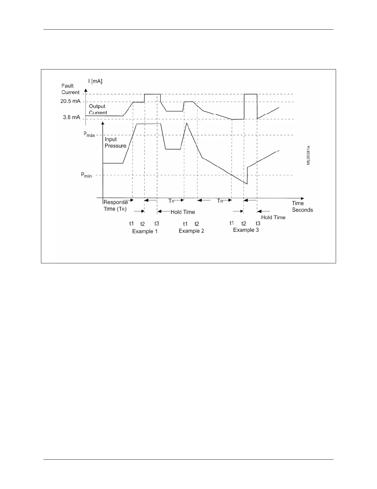 hold time begins. The transmitter outputs the fault current at t2 and holds that output until the hold time