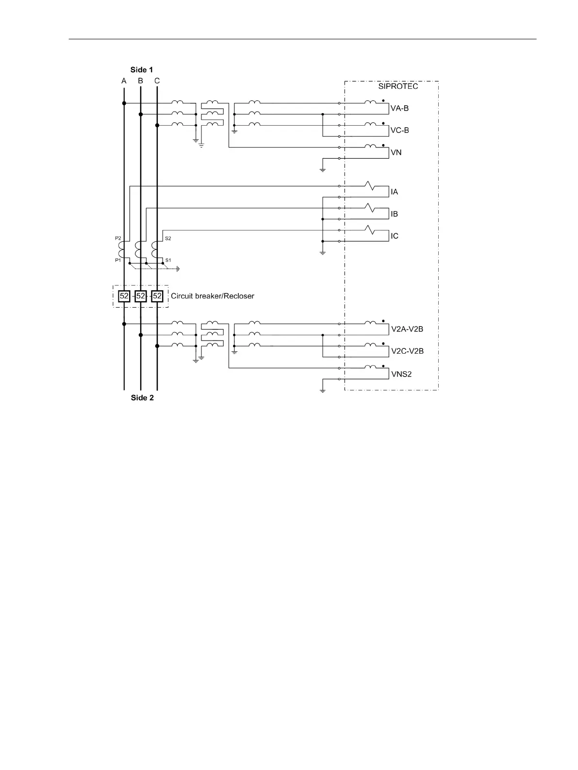 Wiring for 3-phase voltage-transformer connection of side 2: V2A-2B, V2B-2C, VNS2