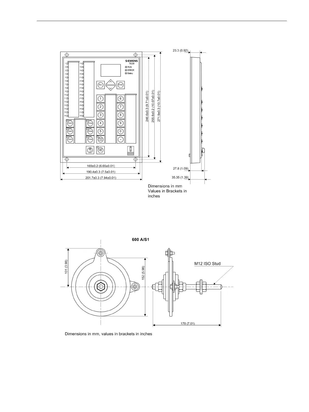 Dimensional drawing of an 7SC80 HMI