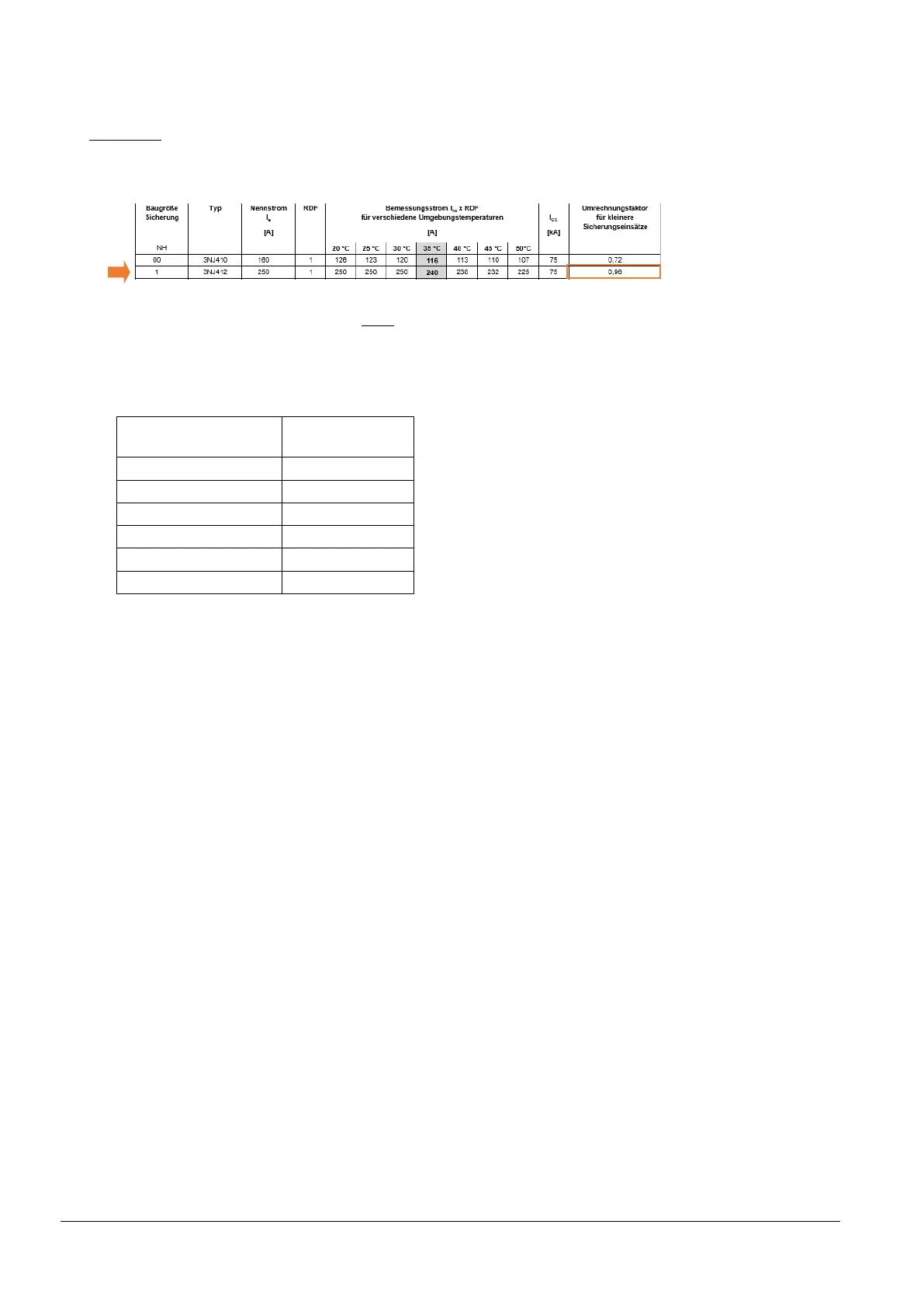 Bemessungsströme kleinerer Sicherungseinsätze gleicher Baugröße anstelle der geprüften, ermitteln sich über die Multiplikation des