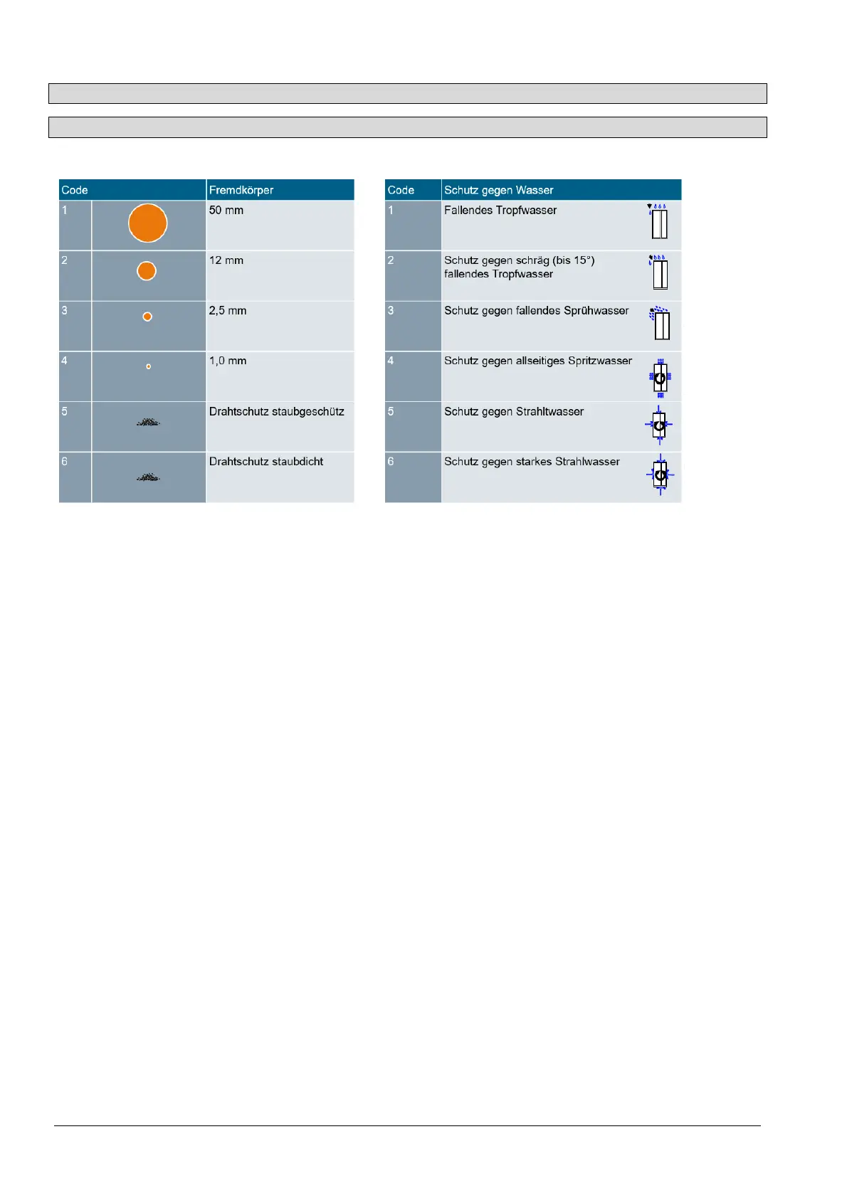 • Eindringen von festen Fremdkörpern: 2,5 mm Durchmesser