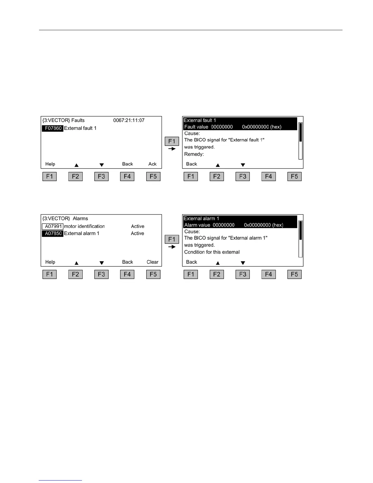 Alarms that are no longer active are removed from the alarm memory with F5 Clear.