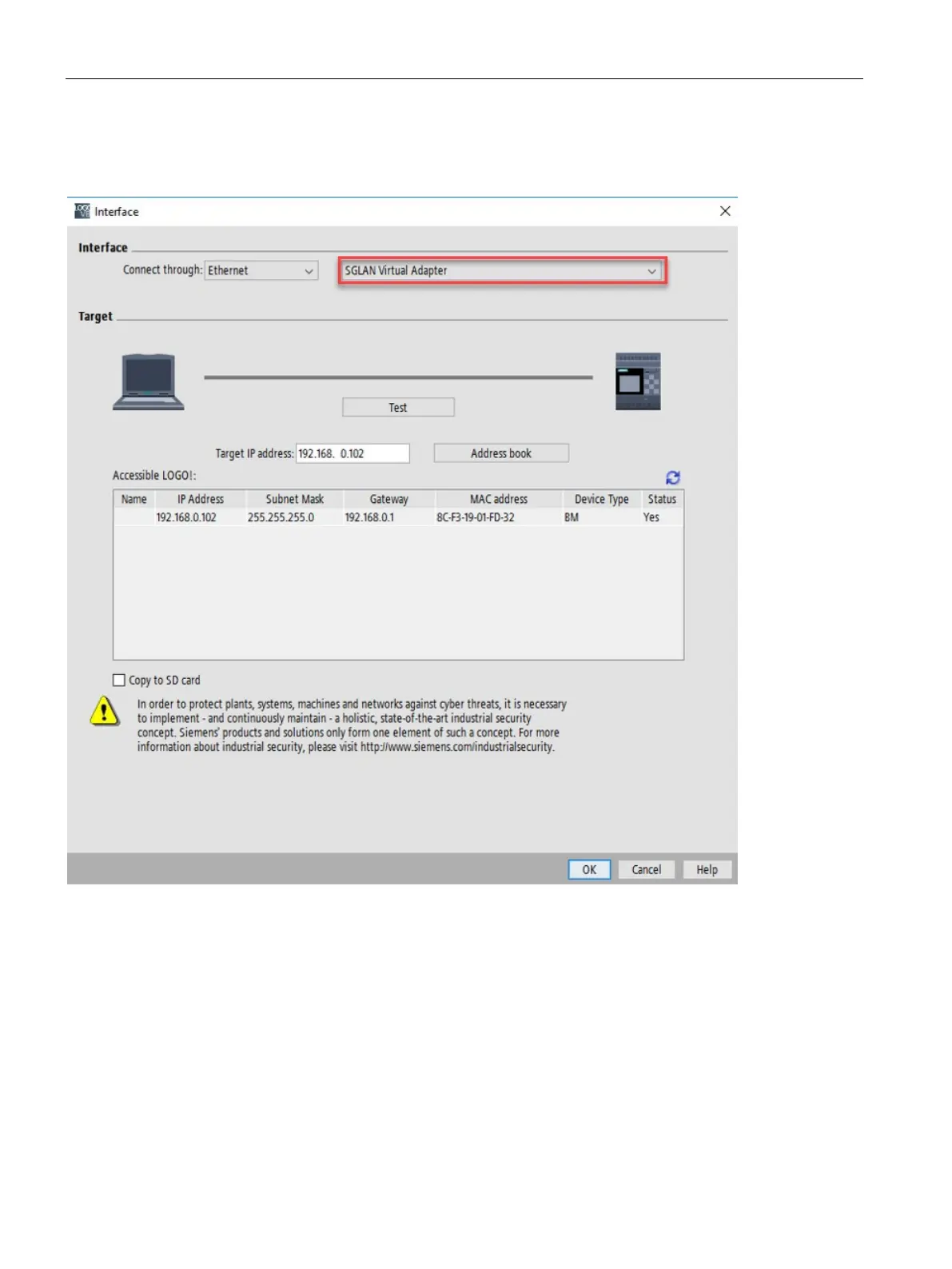 3. Set the communication interface as "SGLAN Virtual Adapter" and Click "OK".