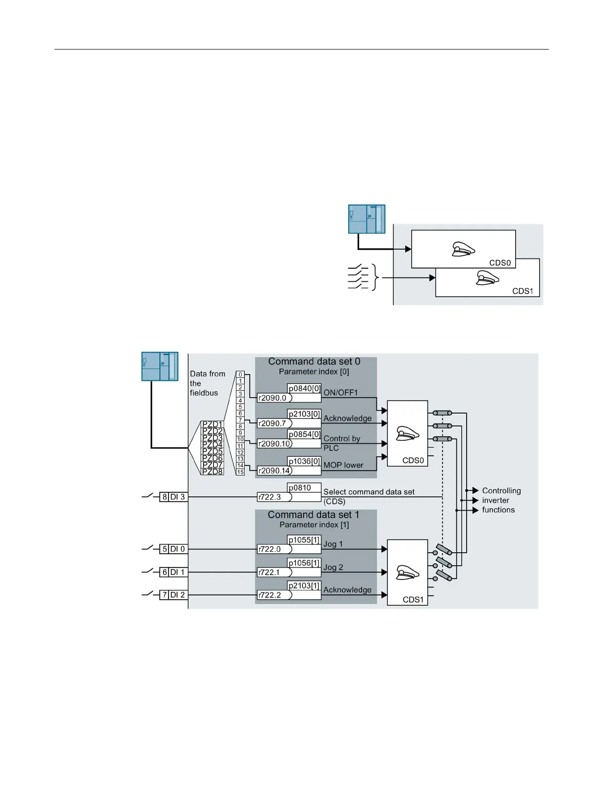 You select the command data set using parameter p0810. To do this, you must interconnect