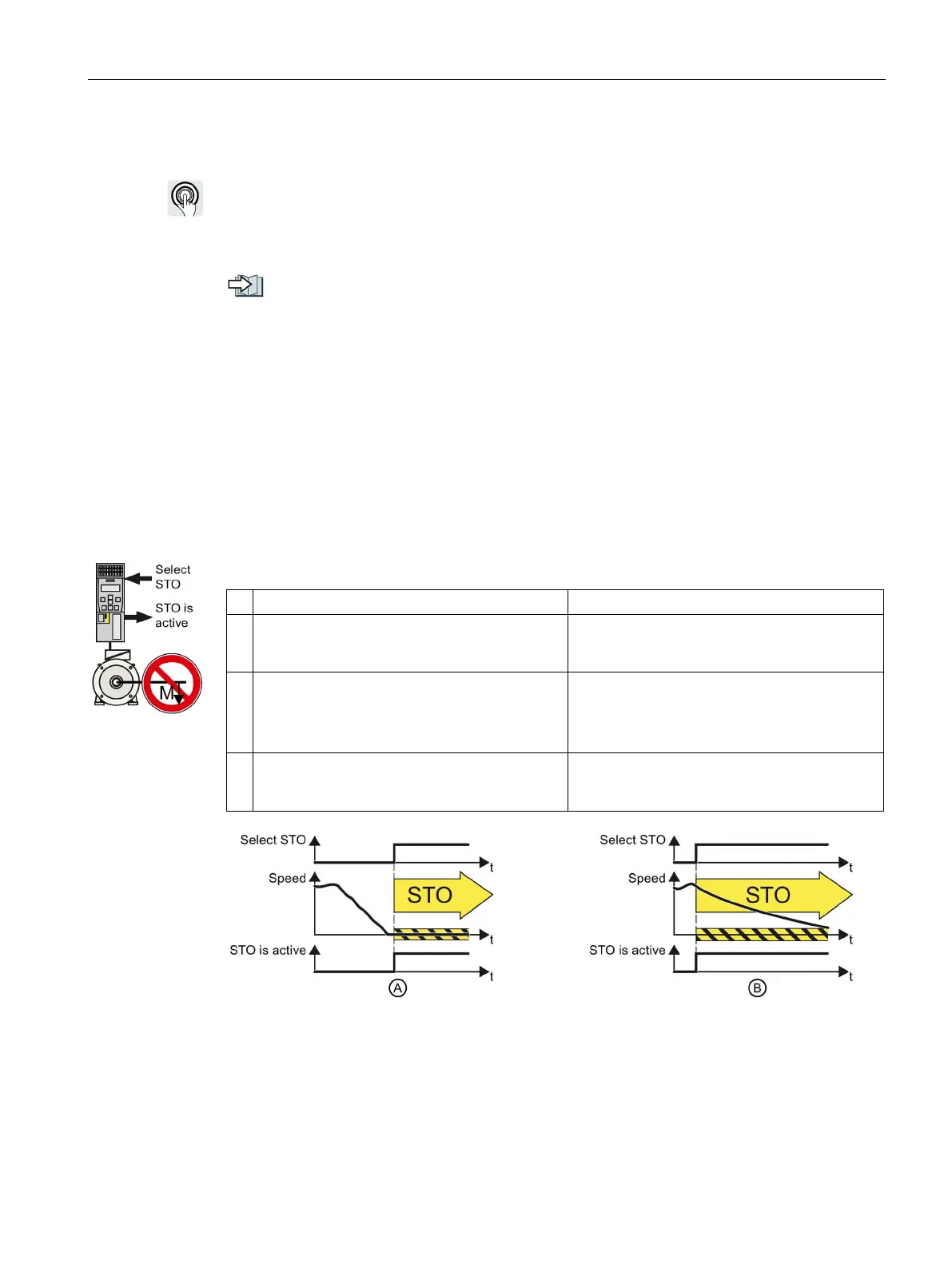 If the motor is still rotating (B) when STO is selected, it coasts down to standstill.