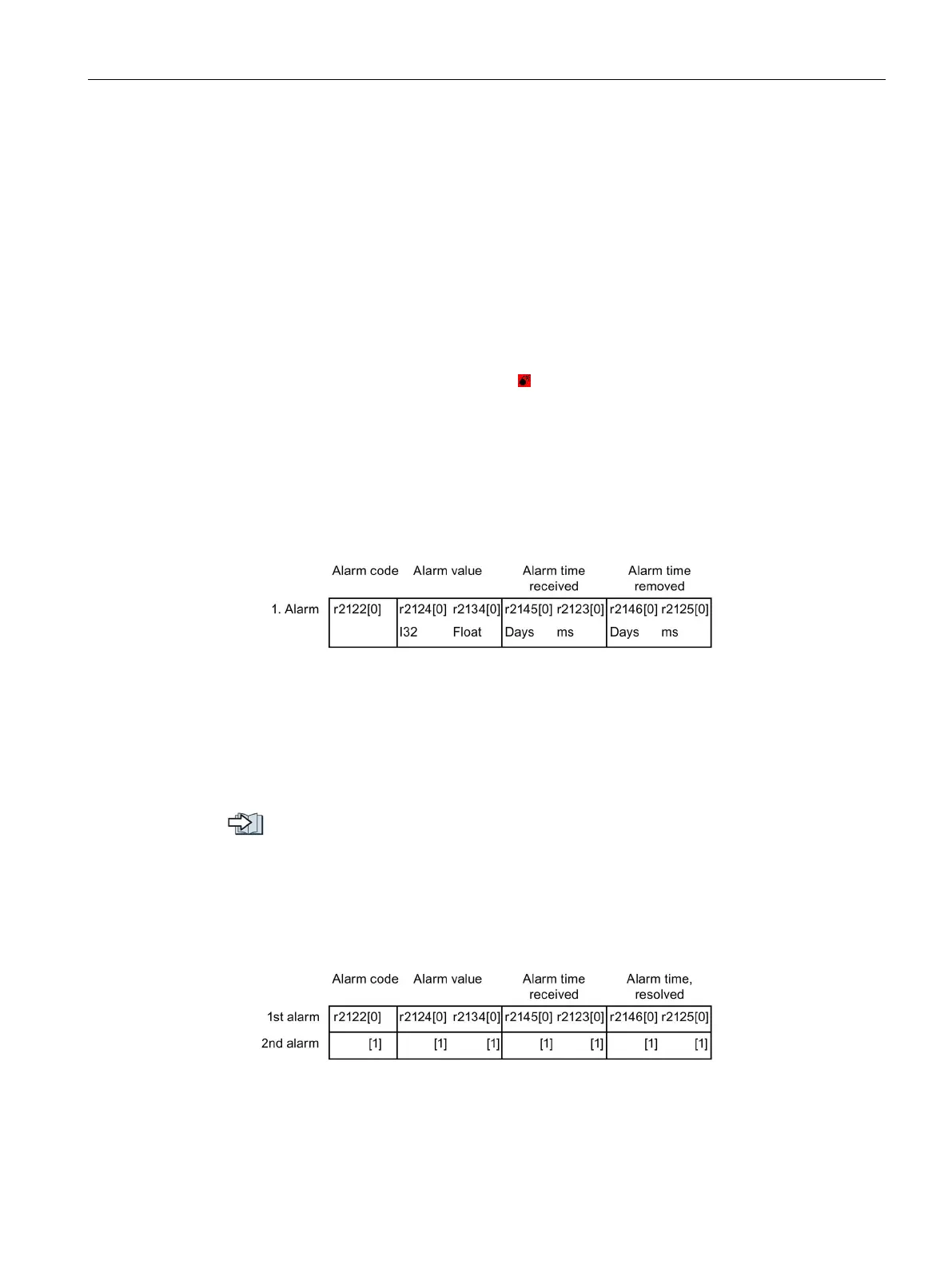 into parameters r2125 and r2146. The alarm remains in the alarm buffer even if the alarm