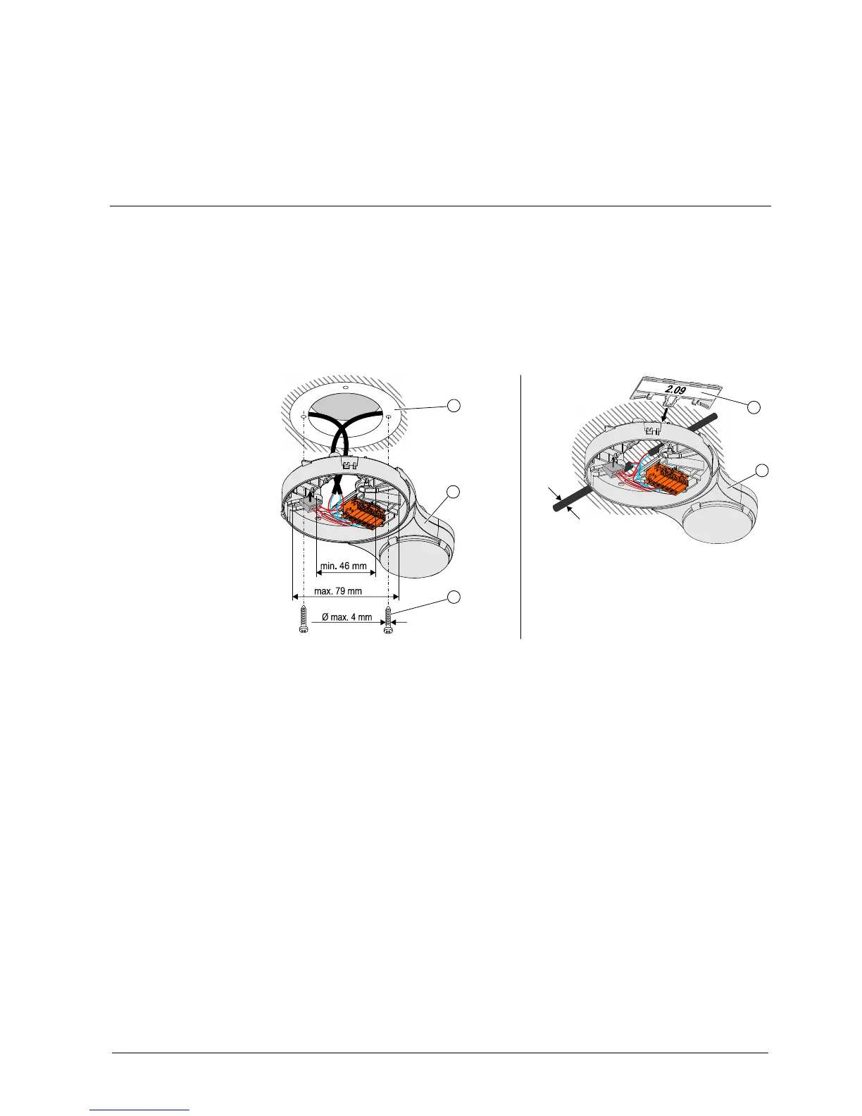 The sounder base is fitted directly on the ceiling. The recess-mounted cable entry