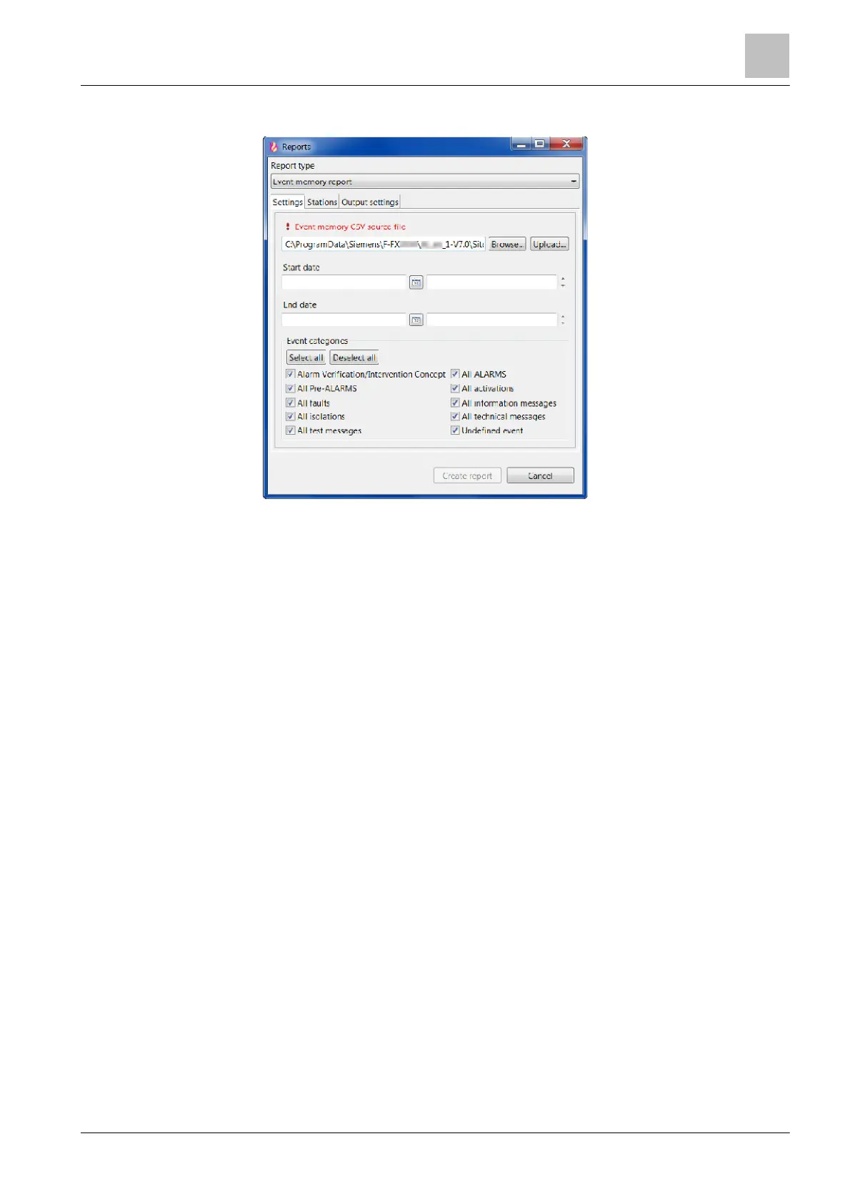 The 'Event memory report' lists the events of a ↑ 'Site'.