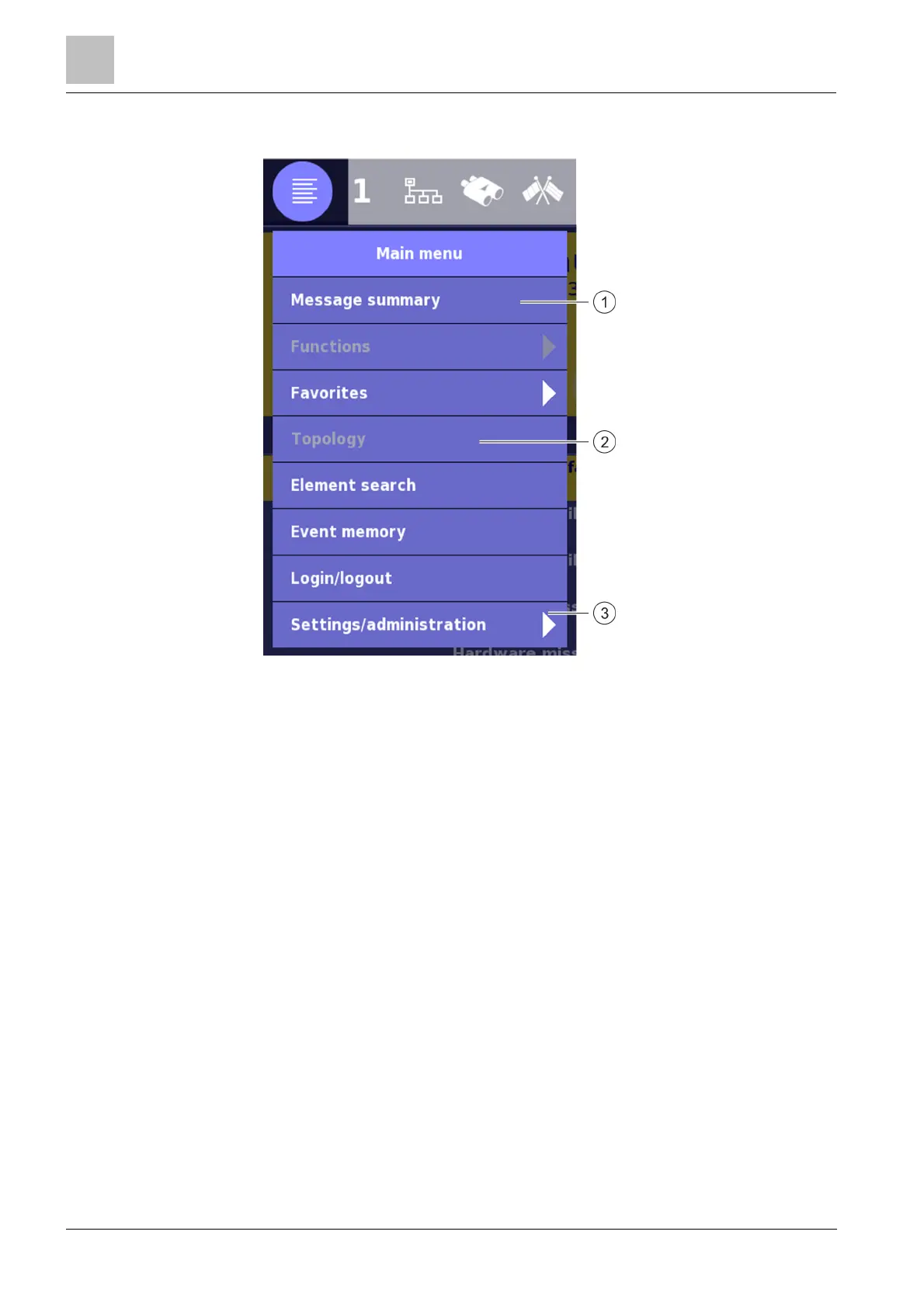 The 'Menu' button opens the 'Main menu'. Gray menu entries cannot be accessed