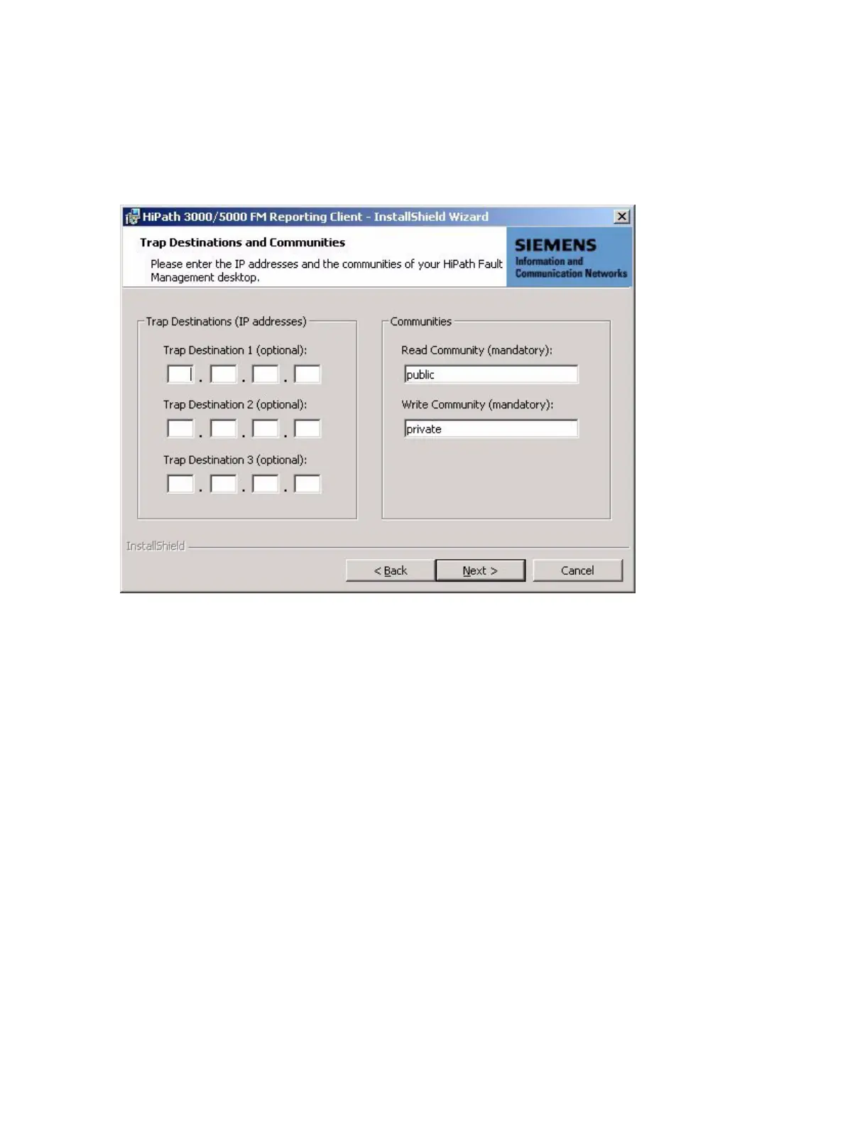 Enter the trap destinations (if necessary) and the HiPath Fault Management desktop com-