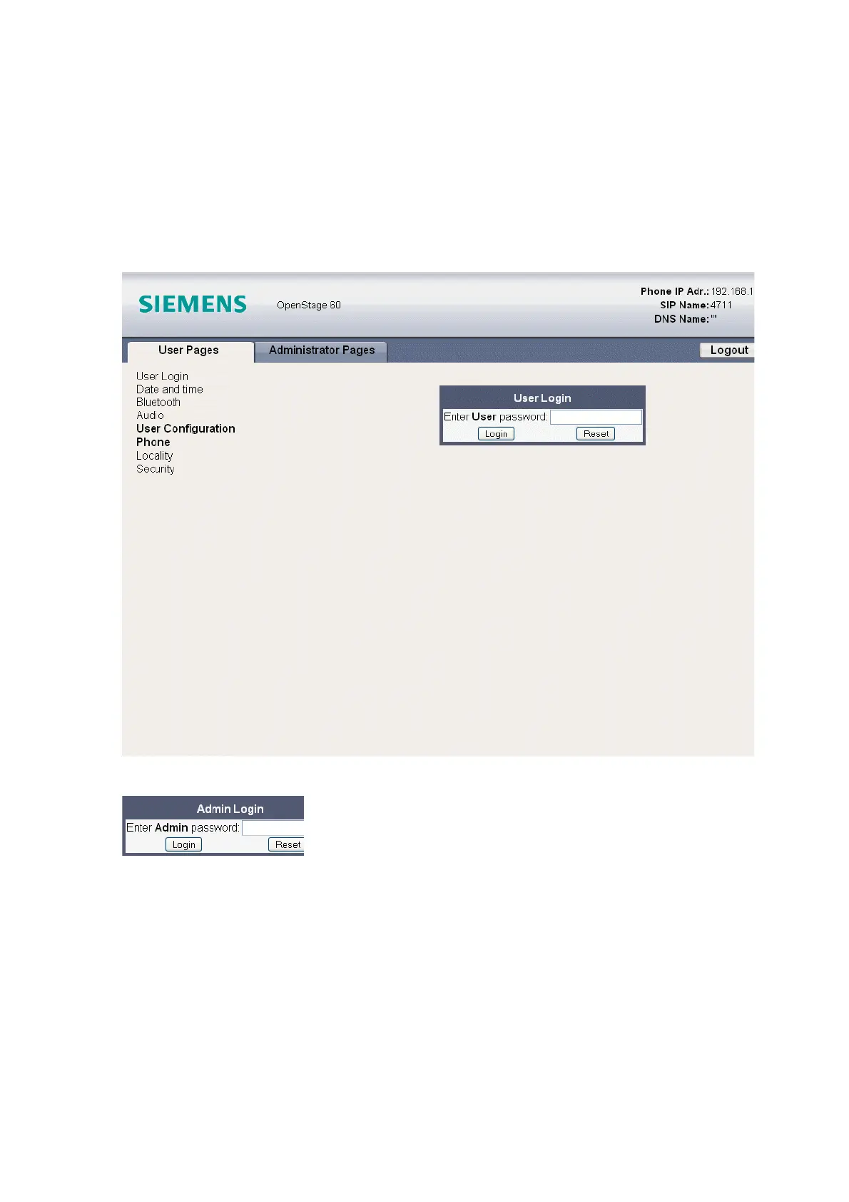 interface appears. In the upper right corner, the phone’s IP address, as well as the SIP