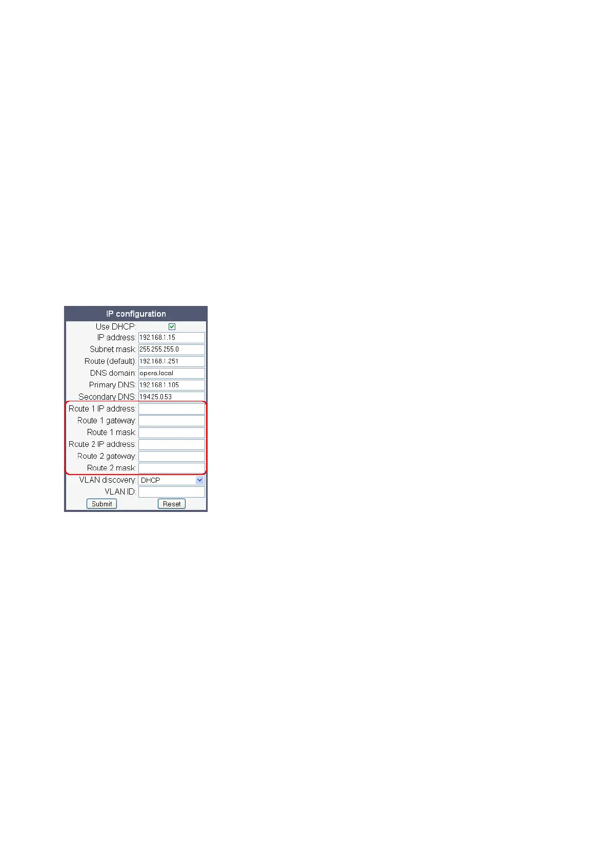 • Route 1/2 gateway: IP address of the gateway for the selected route.