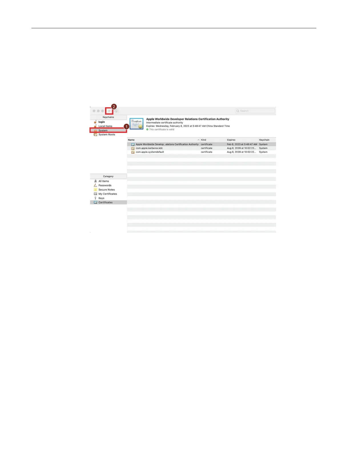 2. To add a certificate, select "system" ① , then click "+"②.