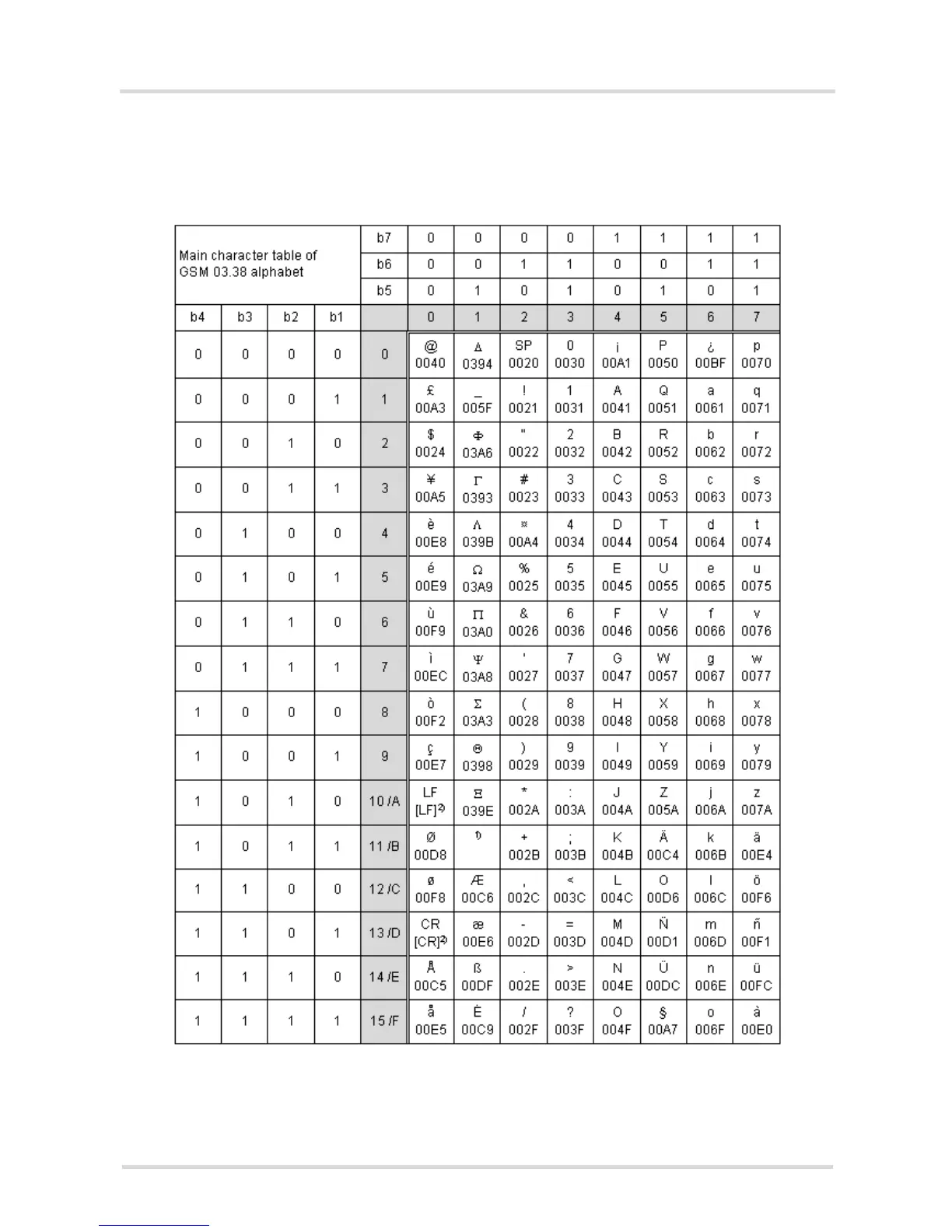 This section provides tables for the GSM 03.38 alphabet supported by the ME. Below any GSM character find