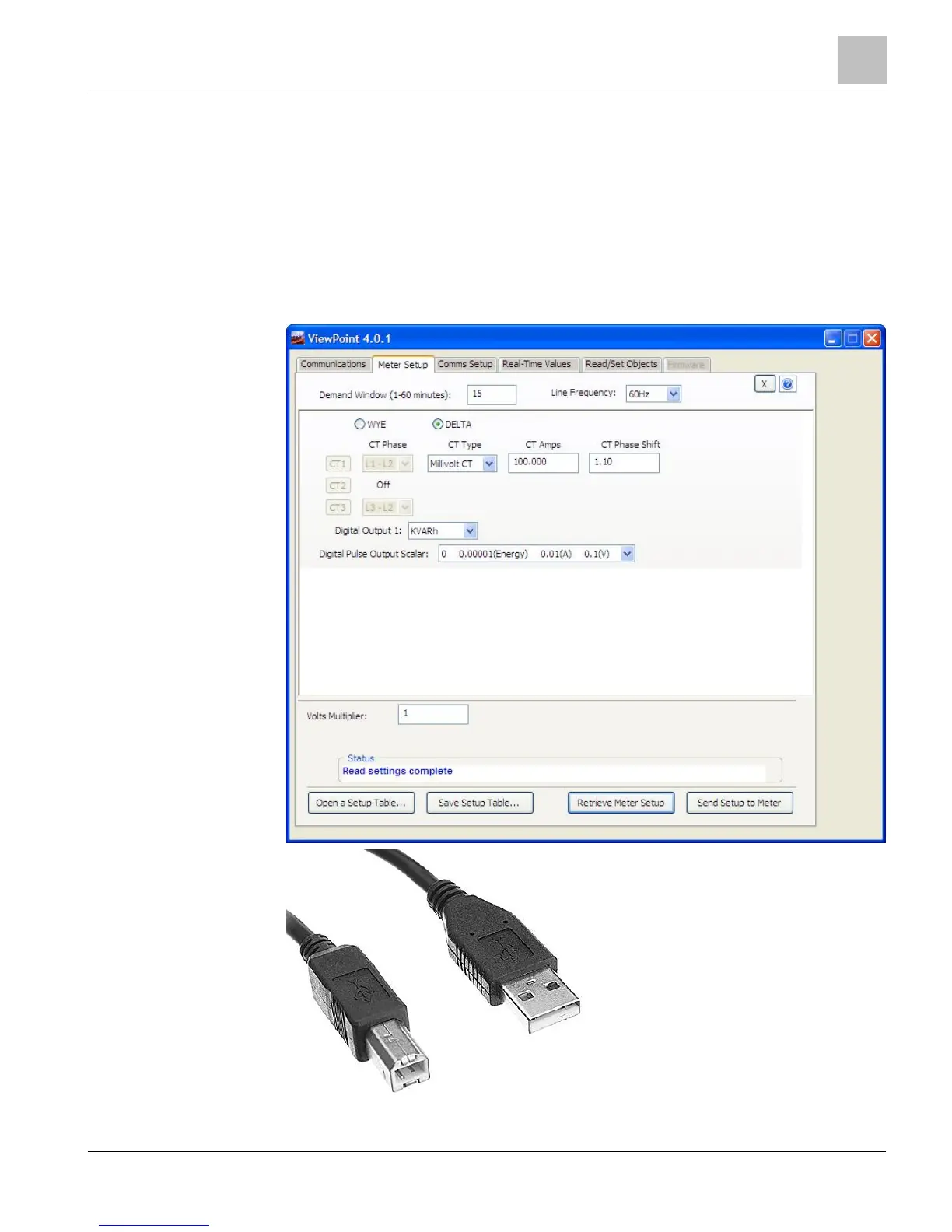 Use Type AB USB Cable from Meter to Computer.