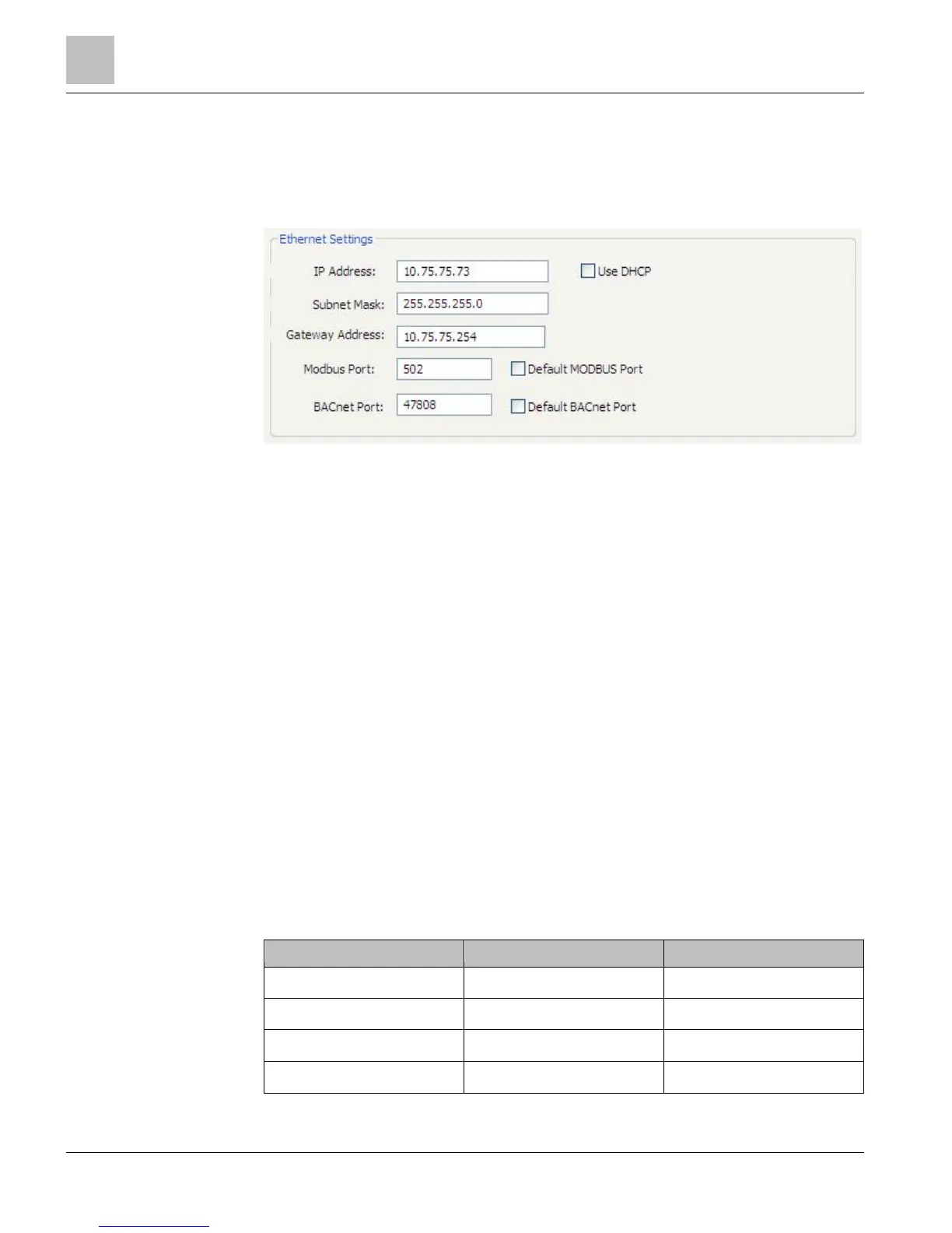 Parameter Defaults Modbus Settings BACnet Settings