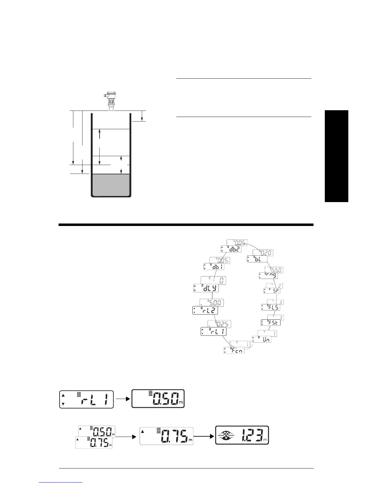 skift værdien (fx. øg til 0,75 m) ny værdi (fx. nyt sætpunkt 0,75 m) efter 6 sek., retur til run mode