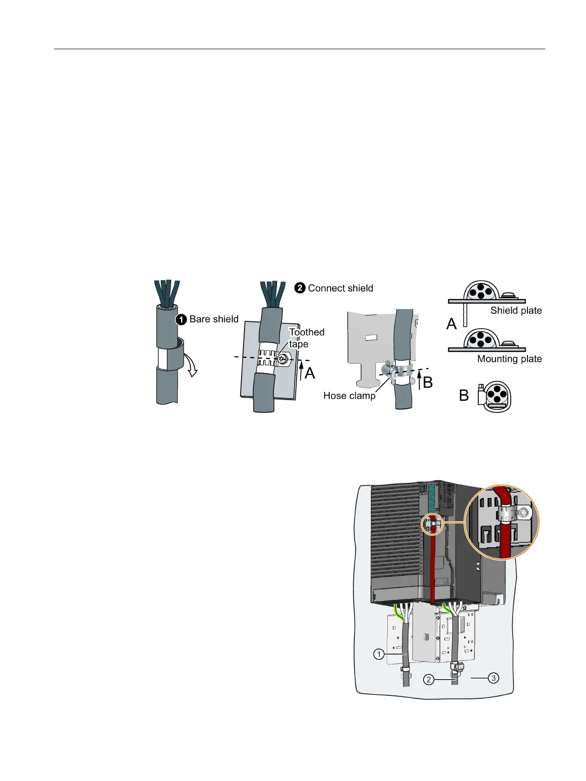 Figure 5-8 Examples of correct EMC-compliant shield connection