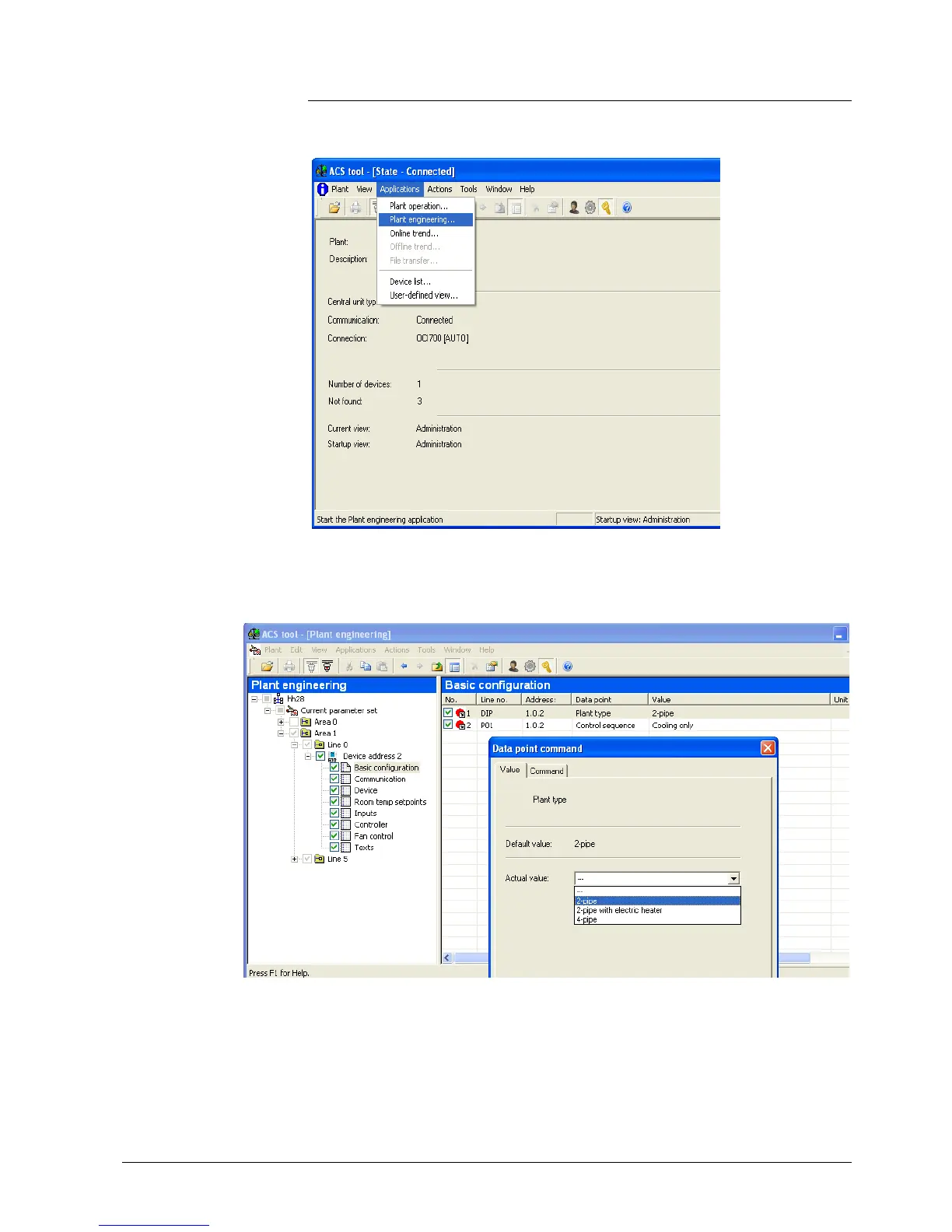 To start the parameter settings, select Applications, then Plant engineering…: