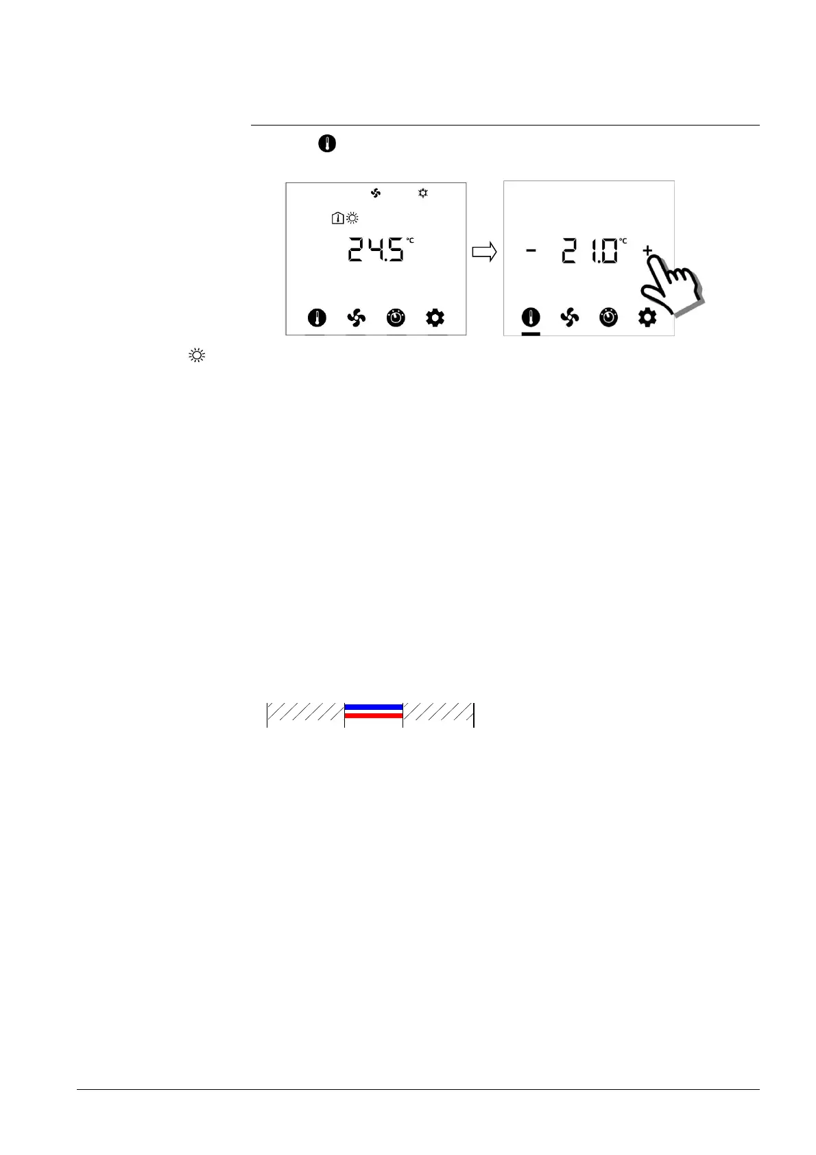 In heating mode, the heating setpoint is active and adjustable using +/-;