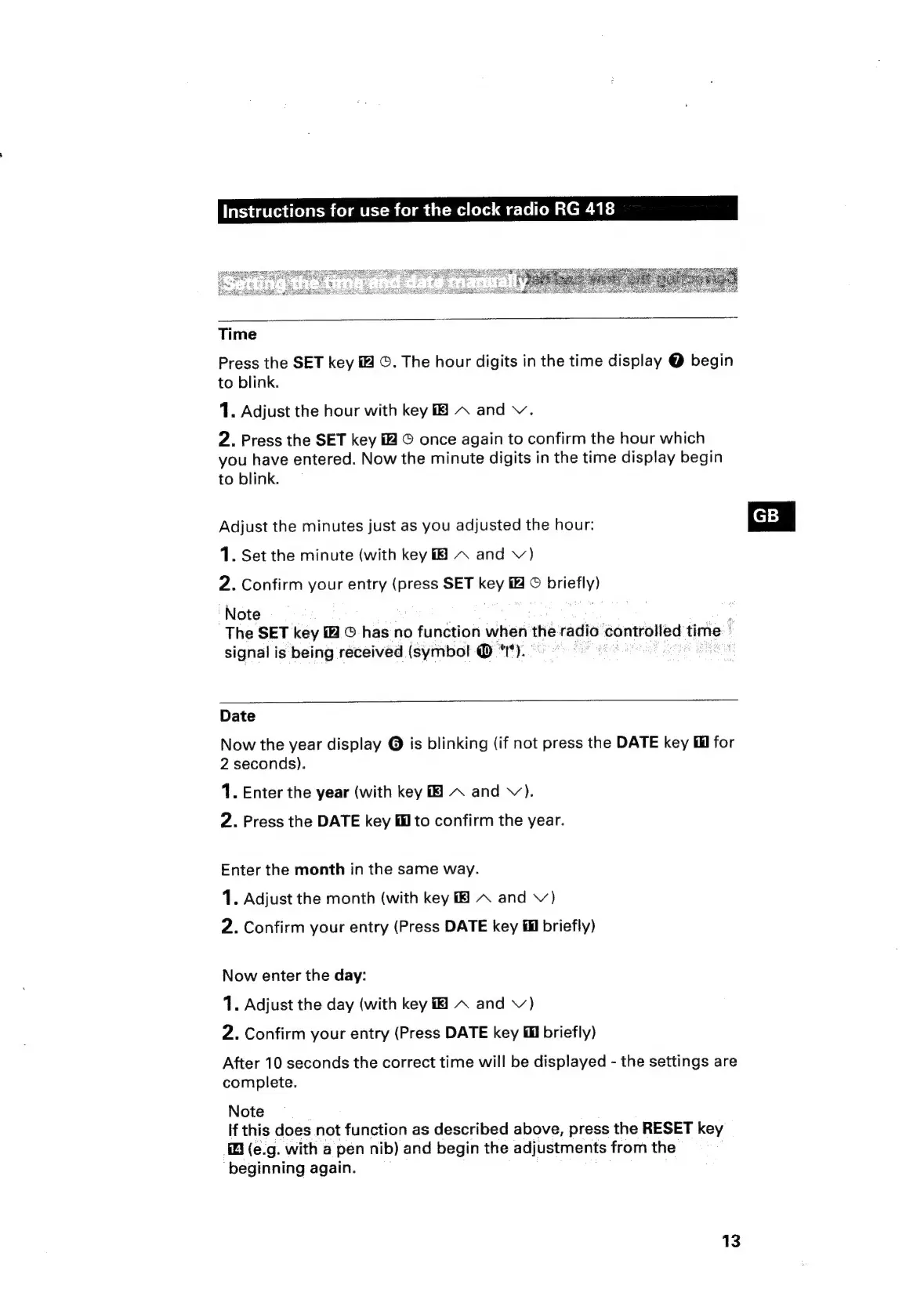 Siemens RG 418 - Manual Time and Date Setting; Setting the Time Manually; Setting the Date Manually