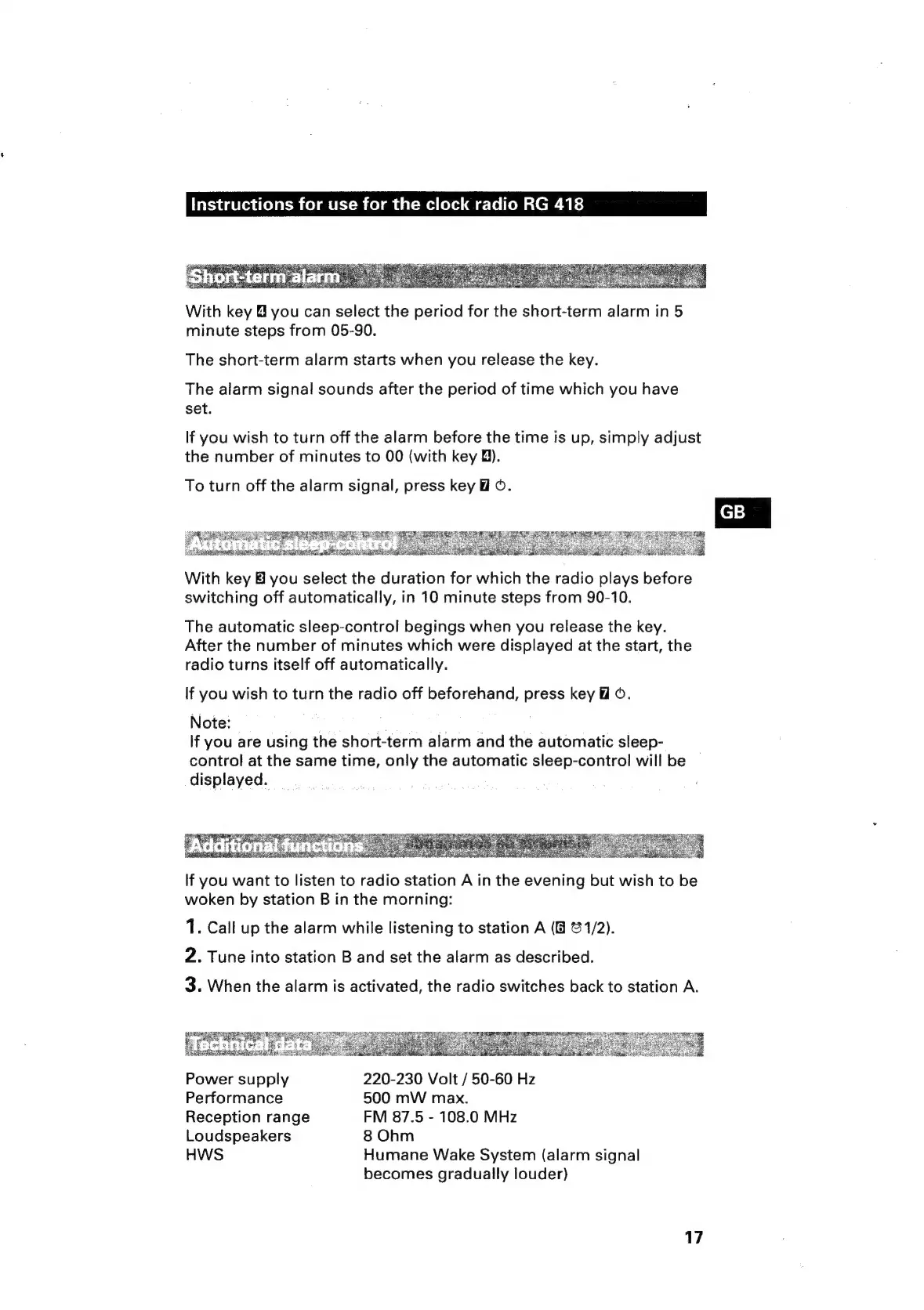 Siemens RG 418 - Additional Functions; Short-term Alarm; Automatic Sleep Control