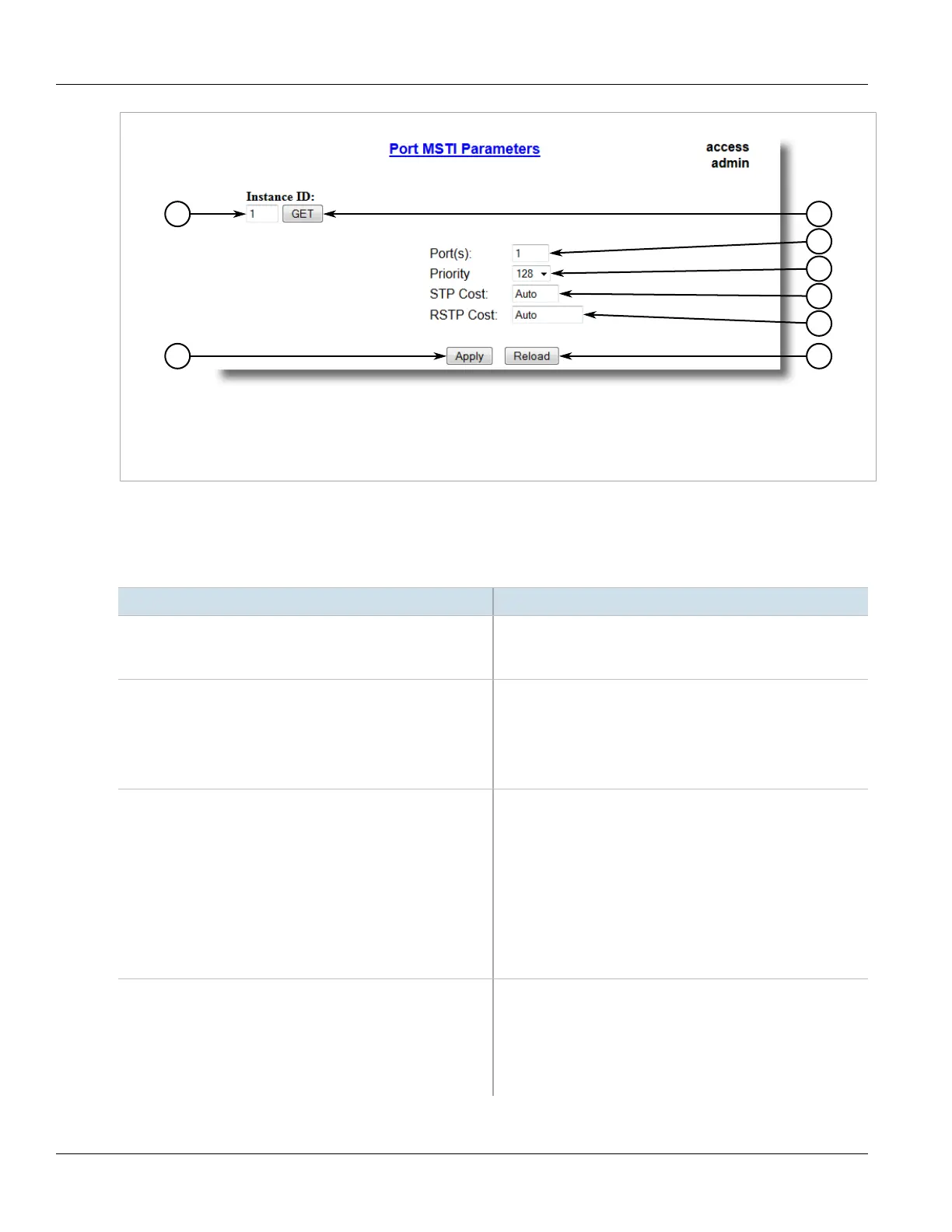 1.Instance ID Box 2.Get Button 3.Port(s) Box 4.Priority List 5.STP Cost Box 6.RSTP Cost Box 7.Apply Button