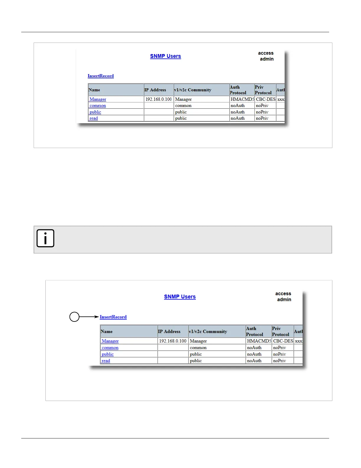 1. Navigate to Administration» Configure SNMP» Configure SNMP Users . The SNMP Users table appears.