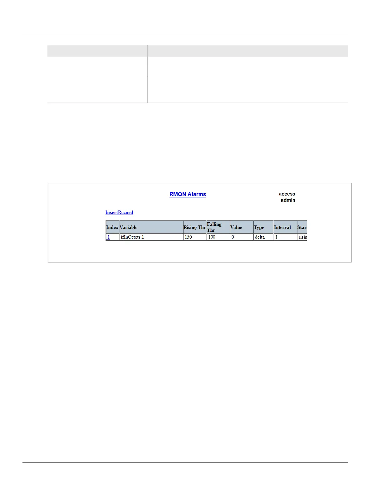 1. Navigate to Ethernet Stats » Configure RMON Alarms. The RMON Alarms table appears.
