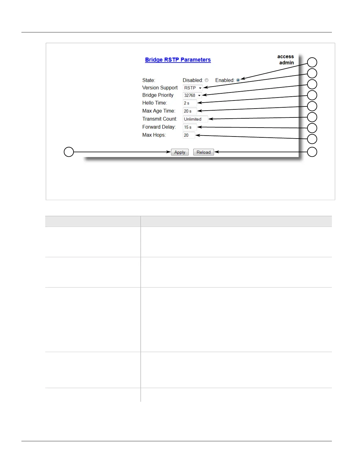 Box 7. Forward Delay Box 8. Max Hops Box 9. Apply Button 10. Reload Button