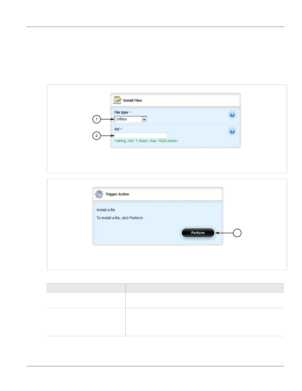 2. Navigate to admin and click install-files in the menu. The Install Files and Trigger Action forms appear.