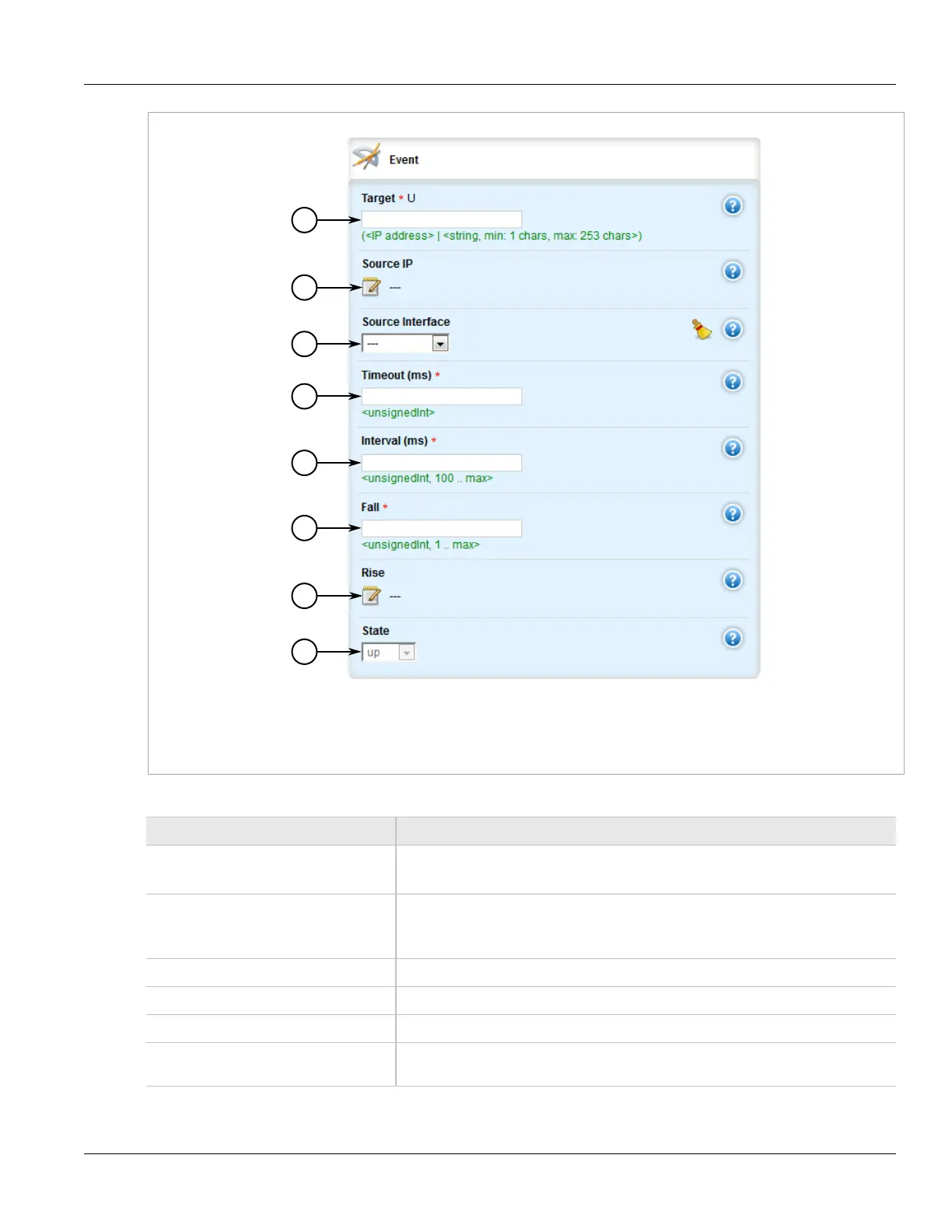 1. Target Box 2. Source IP Box 3. Source Interface Box 4. Timeout Box 5. Interval Box 6. Fall Box 7. Rise Box 8. State