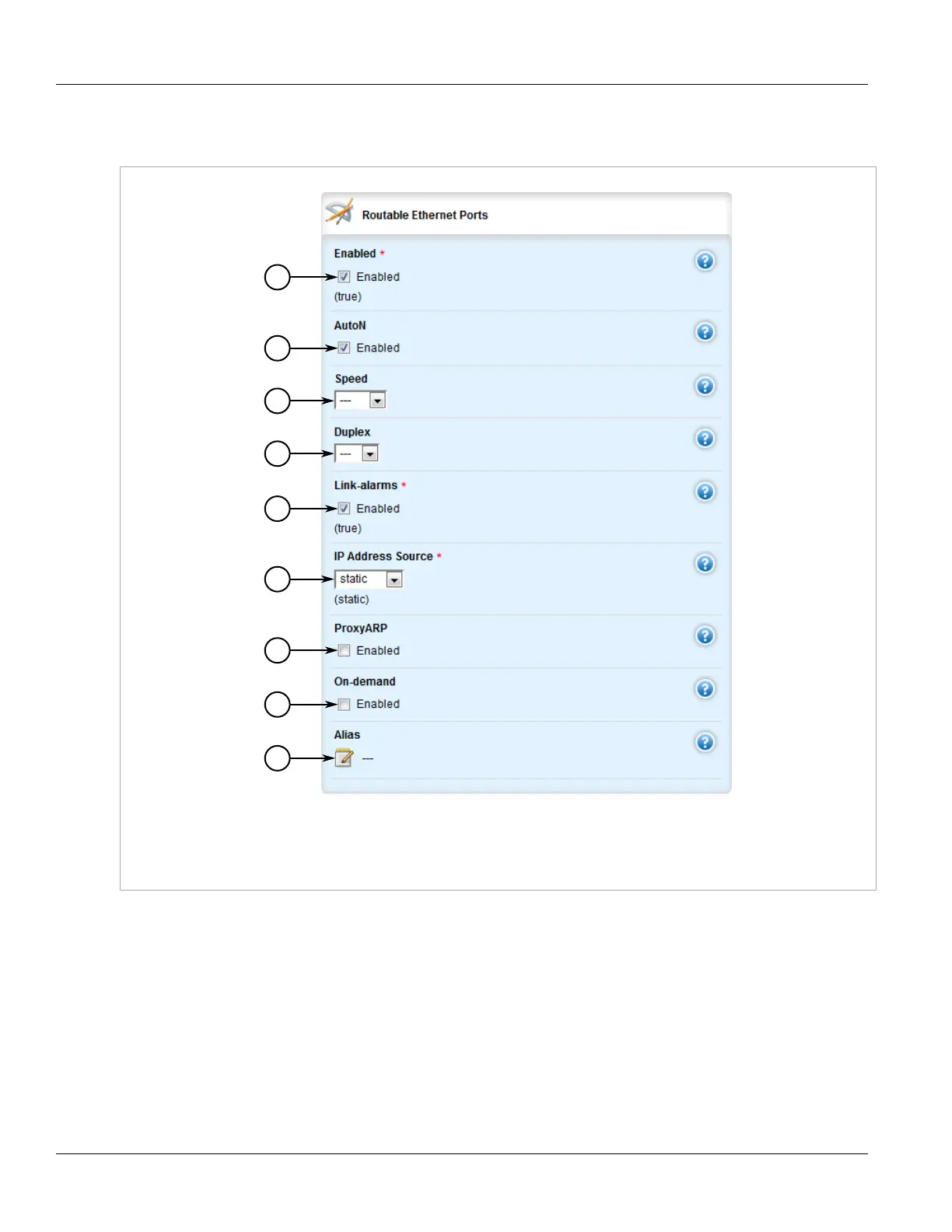 1. Enabled Check Box 2. AutoN Check Box 3. Speed List 4. Duplex List 5. Link Alarms Check Box 6. IP Address Source