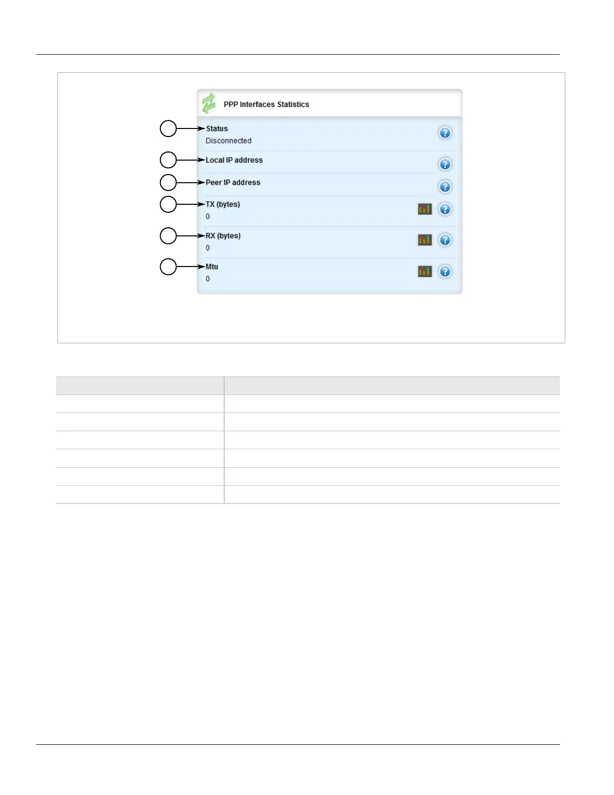 1. Status 2. Local IP Address 3. Peer IP Address 4. TX 5. RX 6. MTU