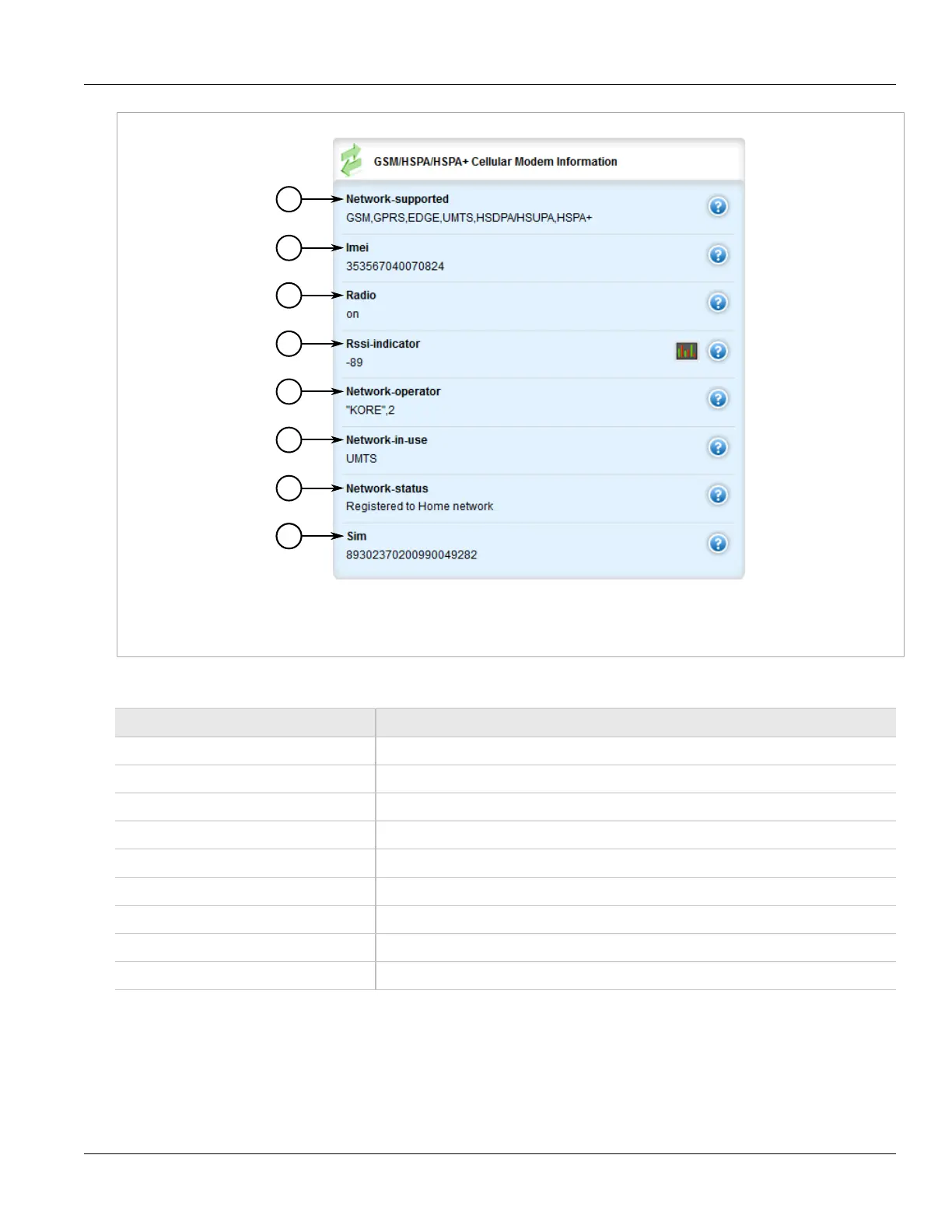 1. Network Supported 2. IMEI 3. Radio 4. RSSI Indicator 5. Network Operator 6. Network In Use 7. Network Status 8. SIM