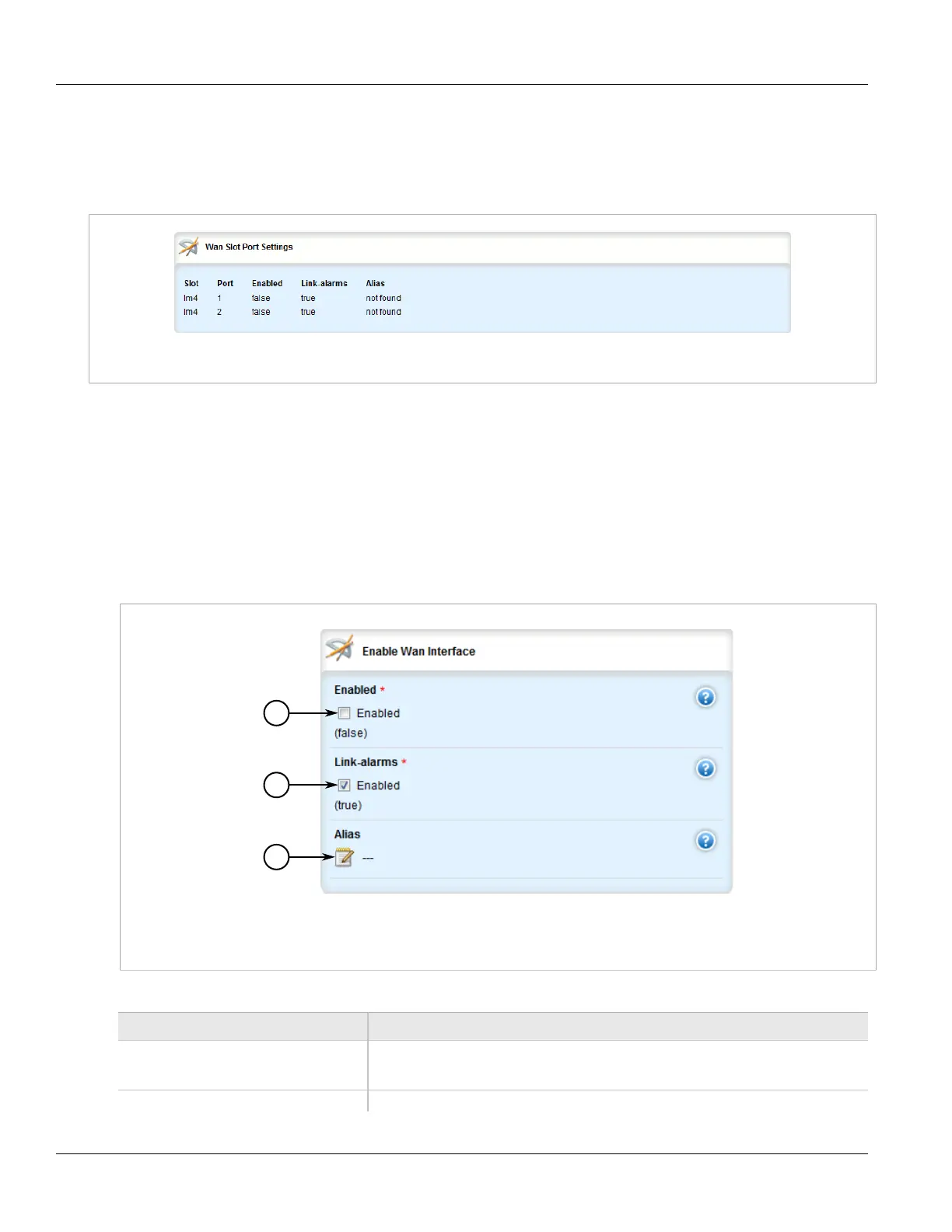 To view a list of WAN interfaces, navigate to interface » wan. The WAN Slot Port Settings table appears.