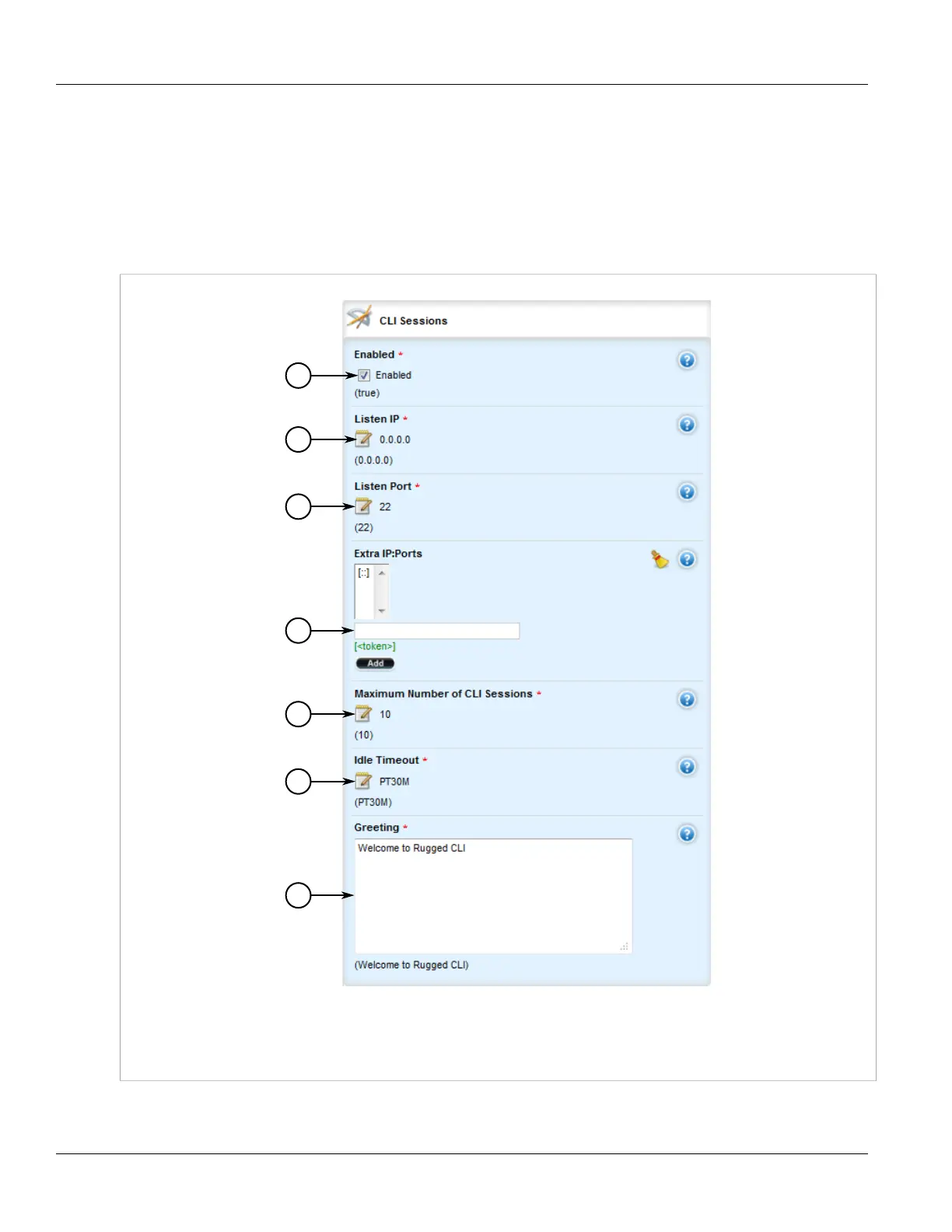 1. Enabled Check Box 2. Listen IP Box 3. Listen Port Box 4. Extra IP Ports Box 5. Maximum Number of CLI Sessions Box