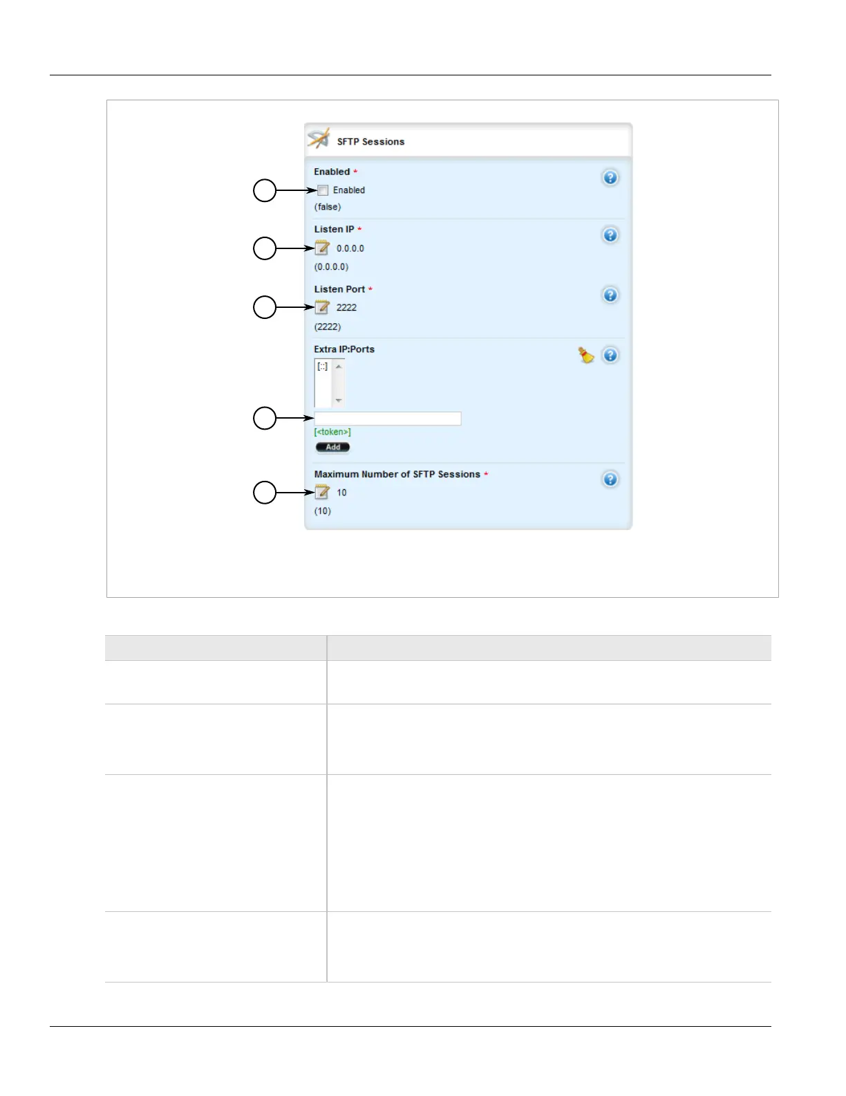 1. Enabled Check Box 2. Listen IP Box 3. Listen Port Box 4. Extra IP Ports Box 5. Maximum Number of SFTP Sessions Box