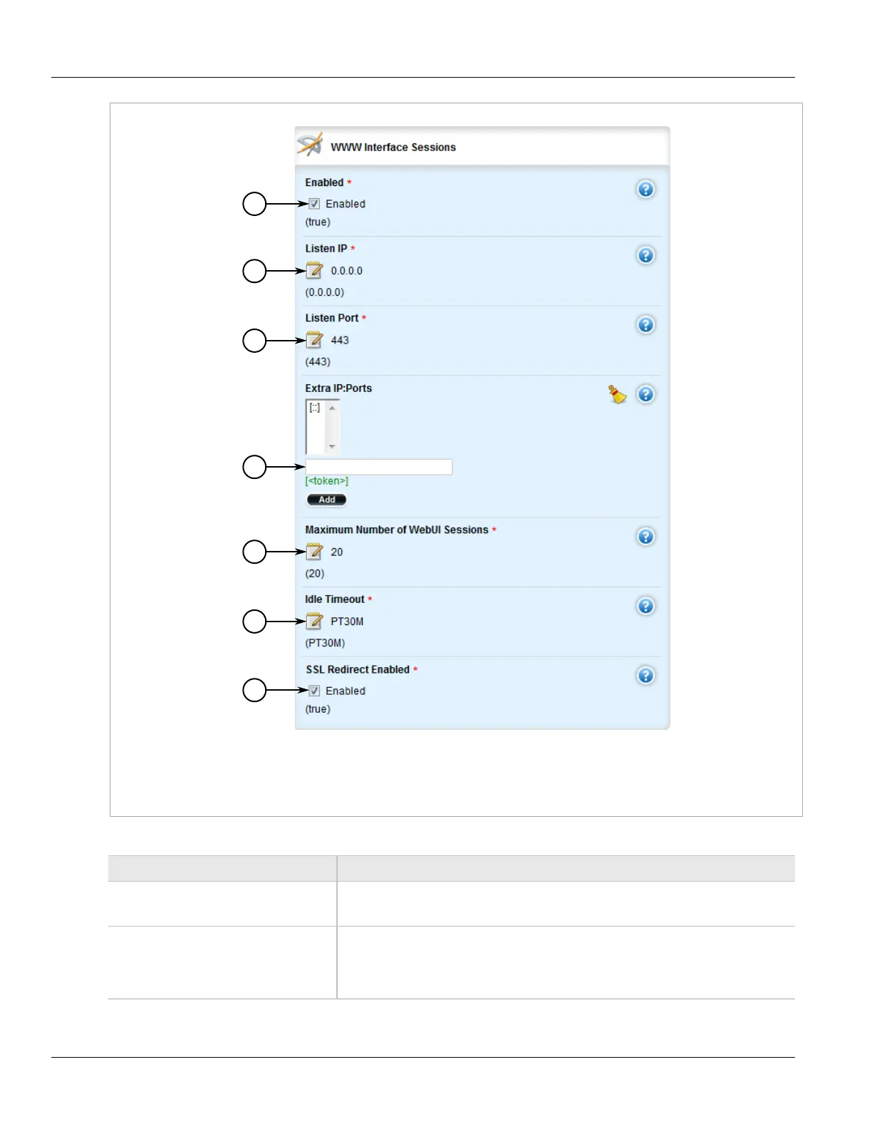 1. Enabled Check Box 2. Listen IP Box 3. Listen Port Box 4. Extra IP Ports Box 5. Maximum Number of WebUI Sessions
