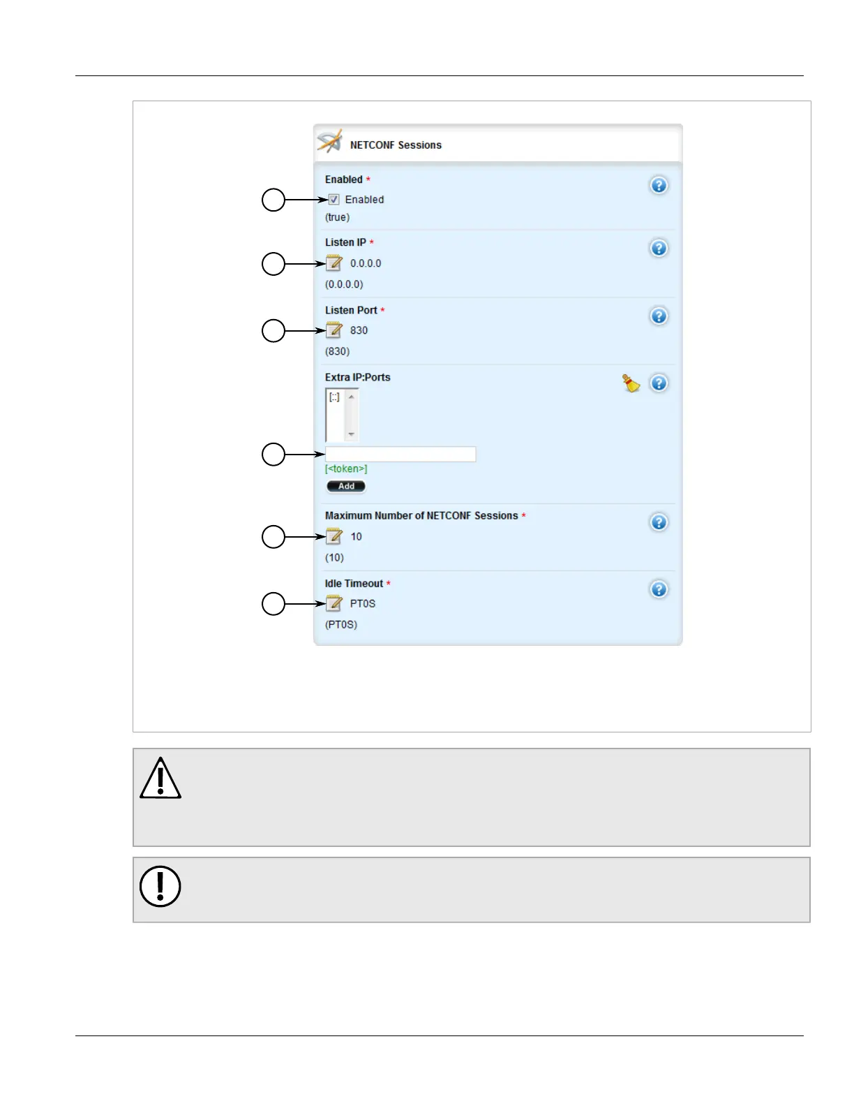 1. Enabled Check Box 2. Listen IP Box 3. Listen Port Box 4. Extra IP Ports Box 5. Maximum Number of NETCONF Sessions