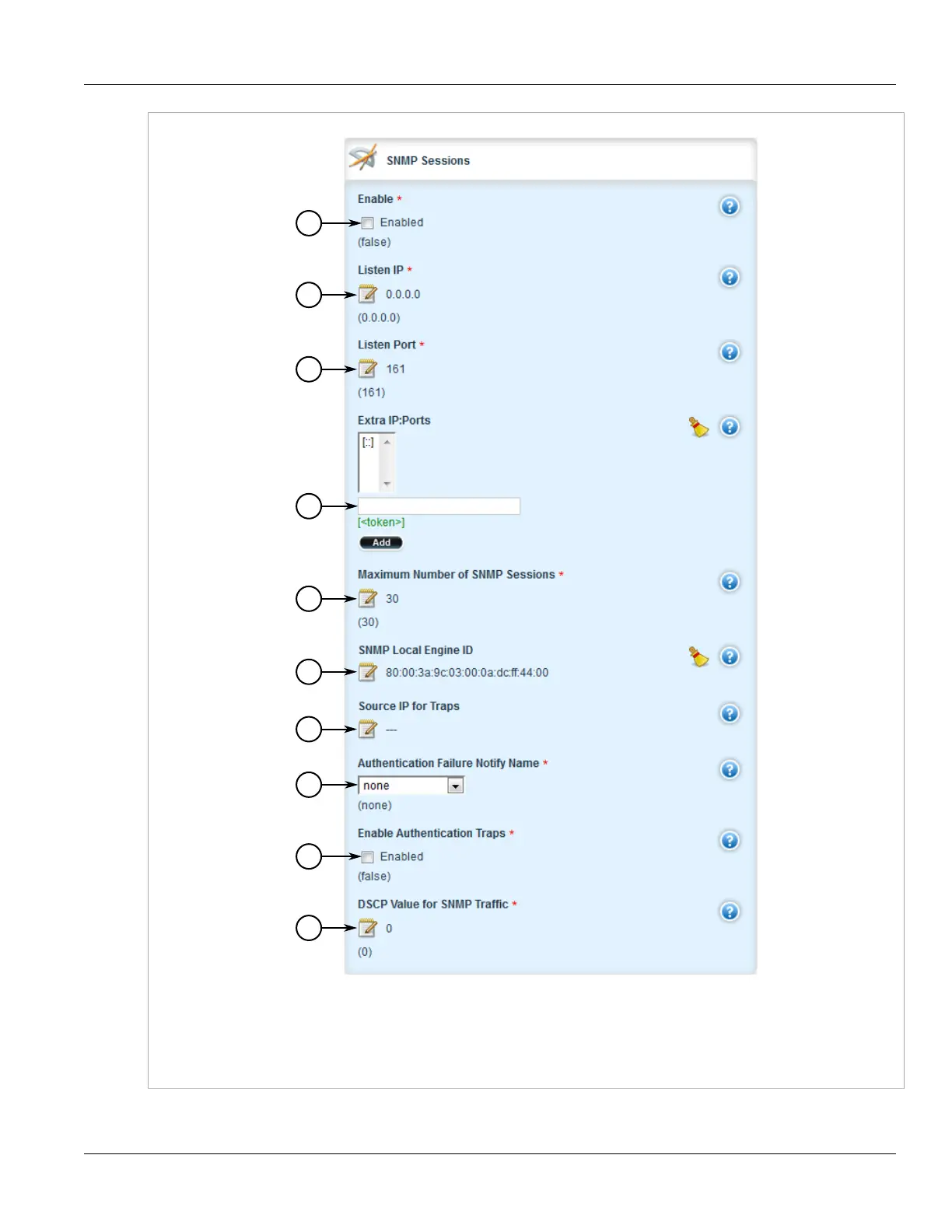 1. Enabled Check Box 2. Listen IP Box 3. Listen Port Box 4. Extra IP Ports Box 5. Maximum Number of SNMP Sessions