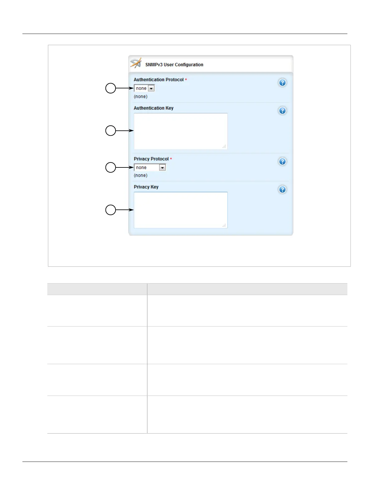 1. Authentication Protocol List 2. Authentication Key Box 3. Privacy Protocol List 4. Privacy Key Box