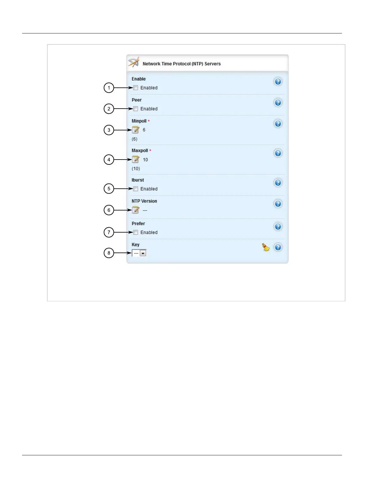 1. Enable Check Box 2. Peer Check Box 3. Mini Poll Box 4. Max Poll Box 5. IBurst Check Box 6. NTP Version Box
