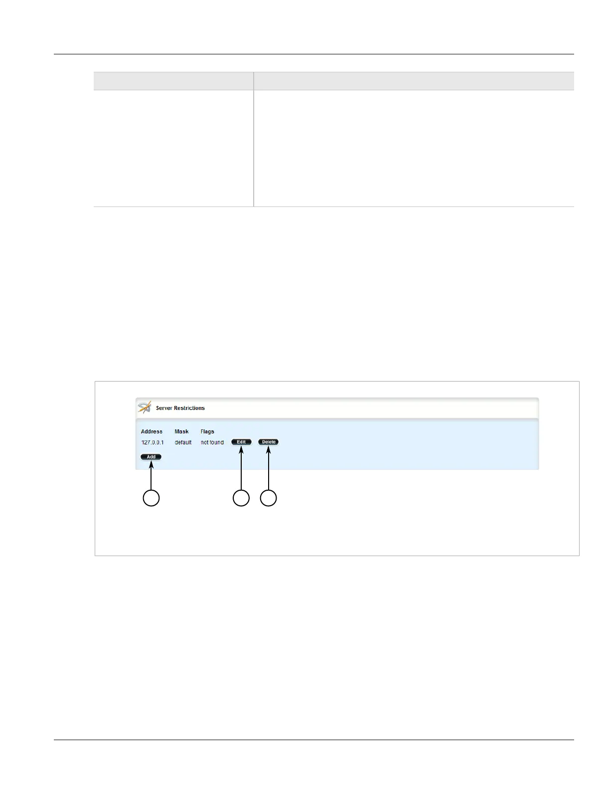2. Navigate to services » time » ntp » restrict. The Server Restrictions table appears.