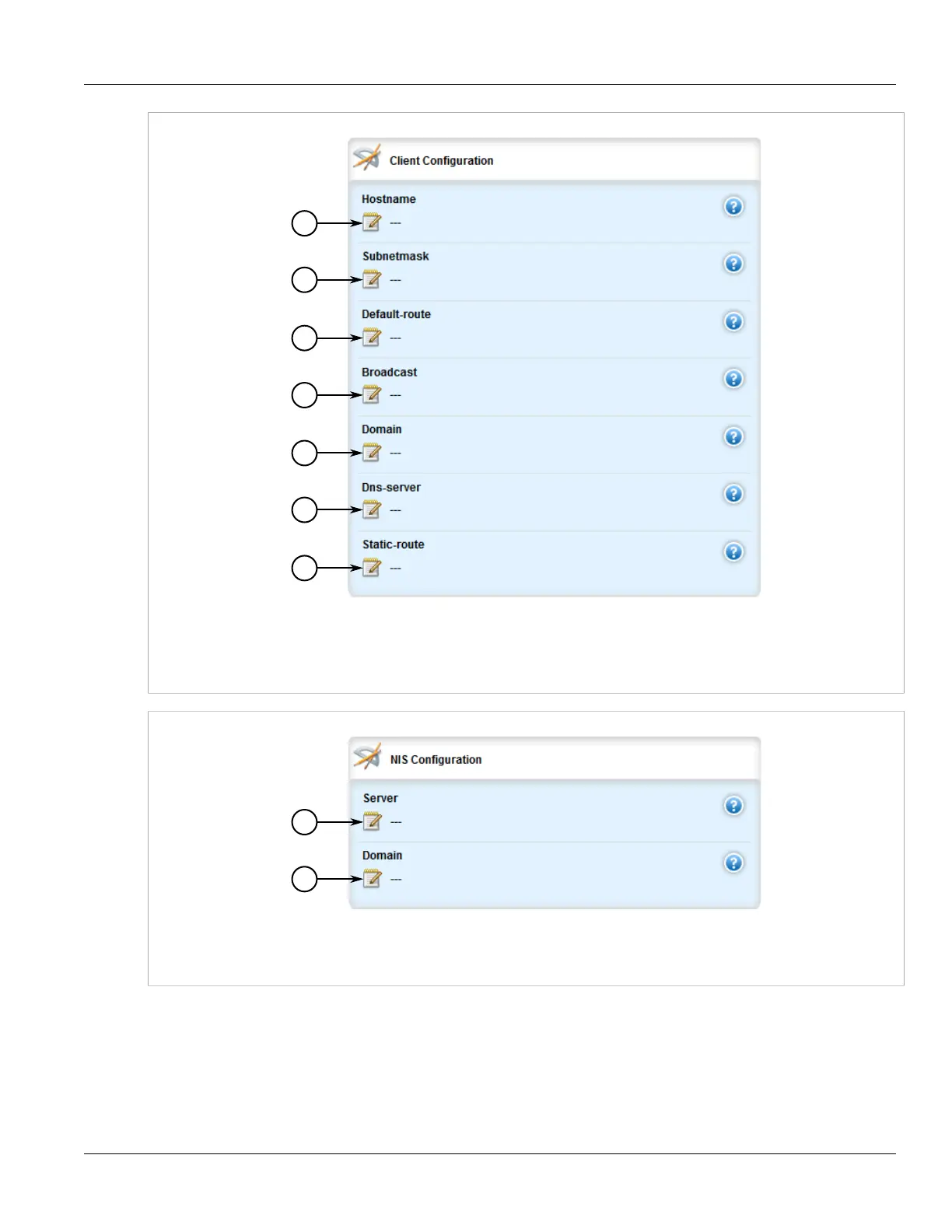 1. Host Name Box 2. Subnet Mask Box 3. Default Route Box 4. Broadcast Box 5. Domain Box 6. DNS Server Box