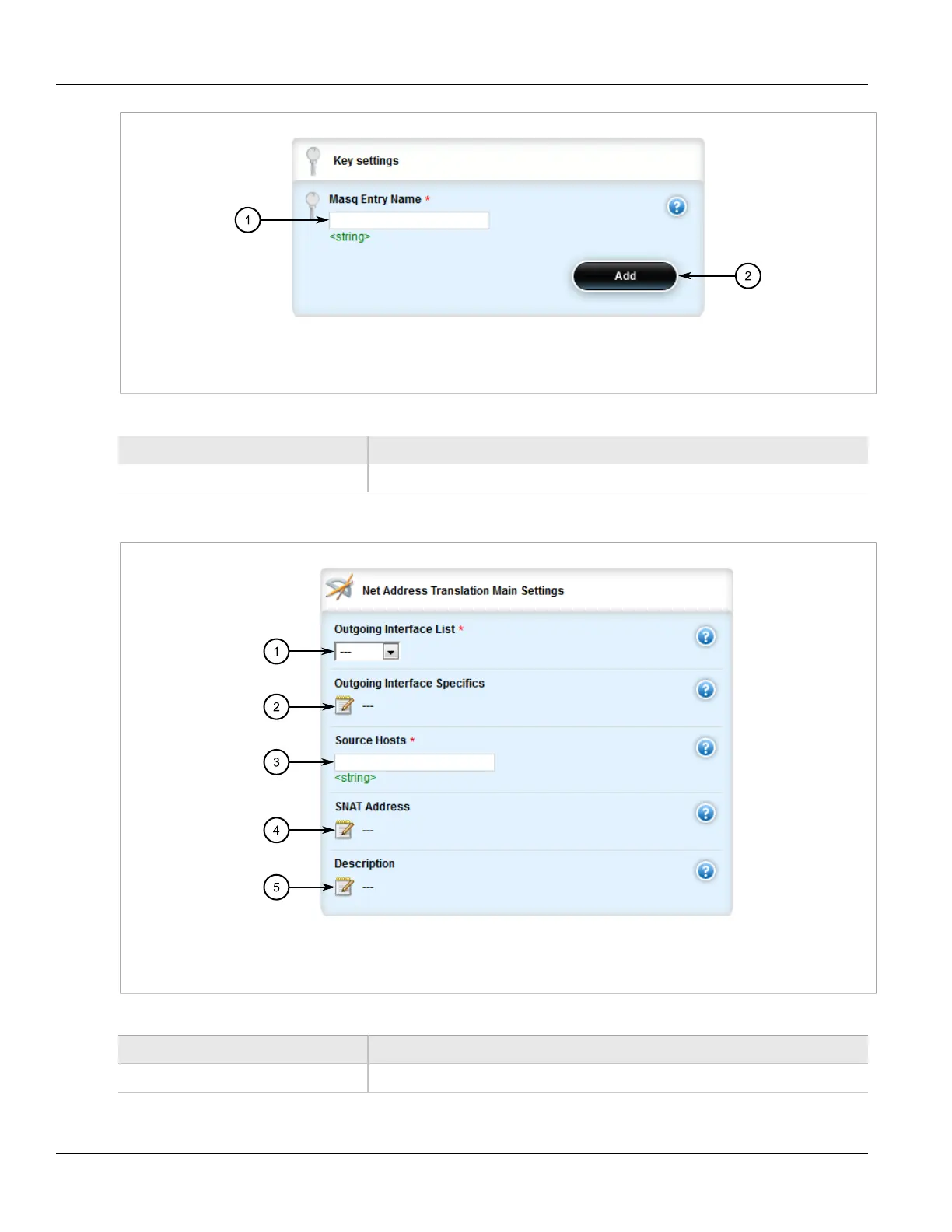 1. Outgoing Interface List 2. Outgoing Interface Specifics Box 3. Source Hosts Box 4. SNAT Address Box 5. Description Box