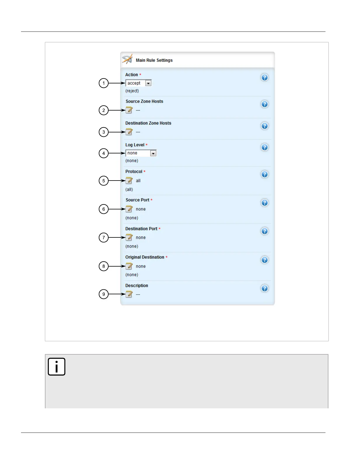 1. Action List 2. Source Zone Hosts Box 3. Destination Zone Hosts Box 4. Log Level List 5. Protocol Box 6. Source Port